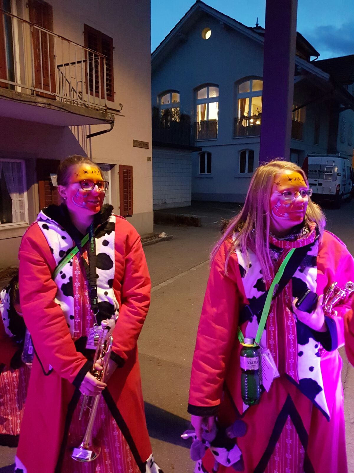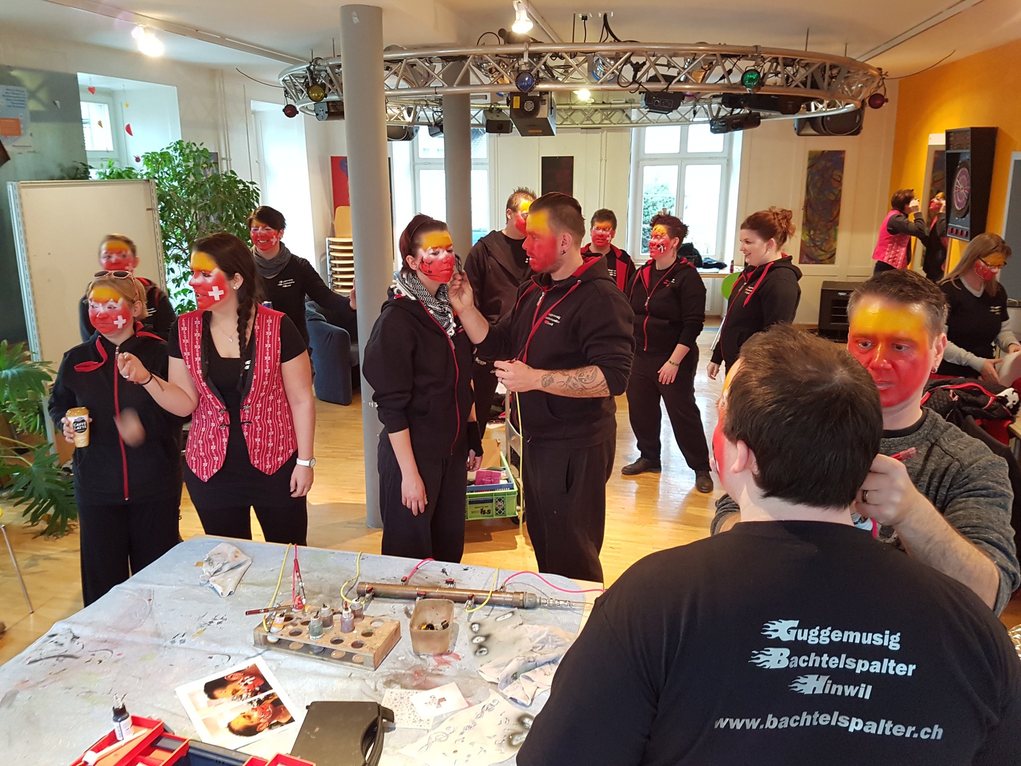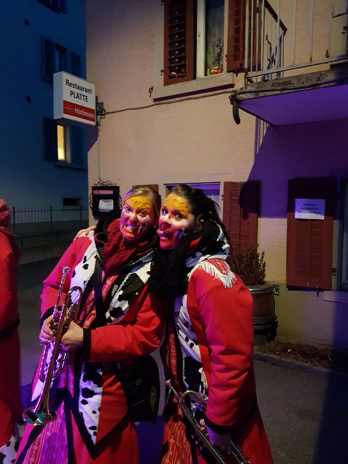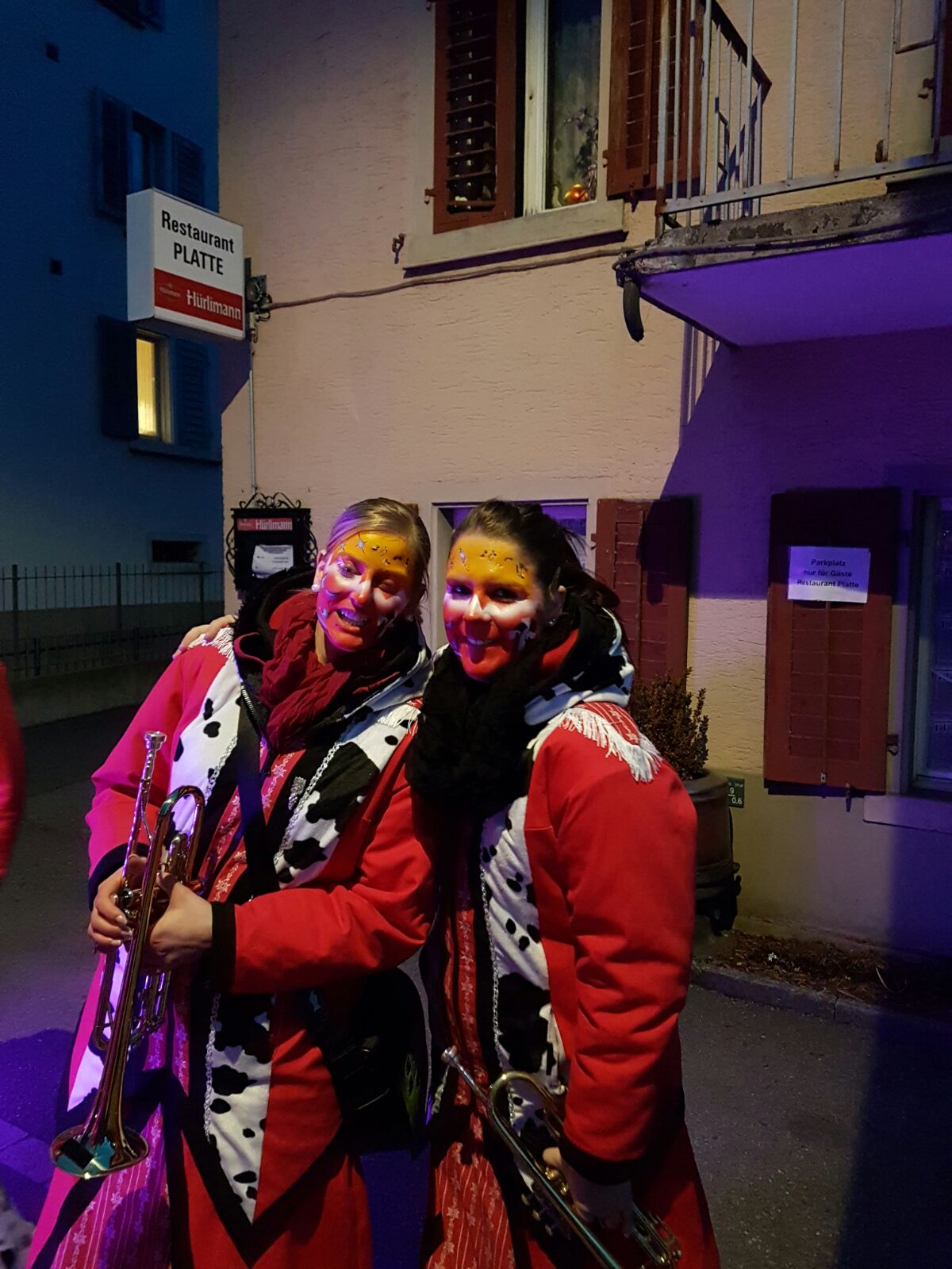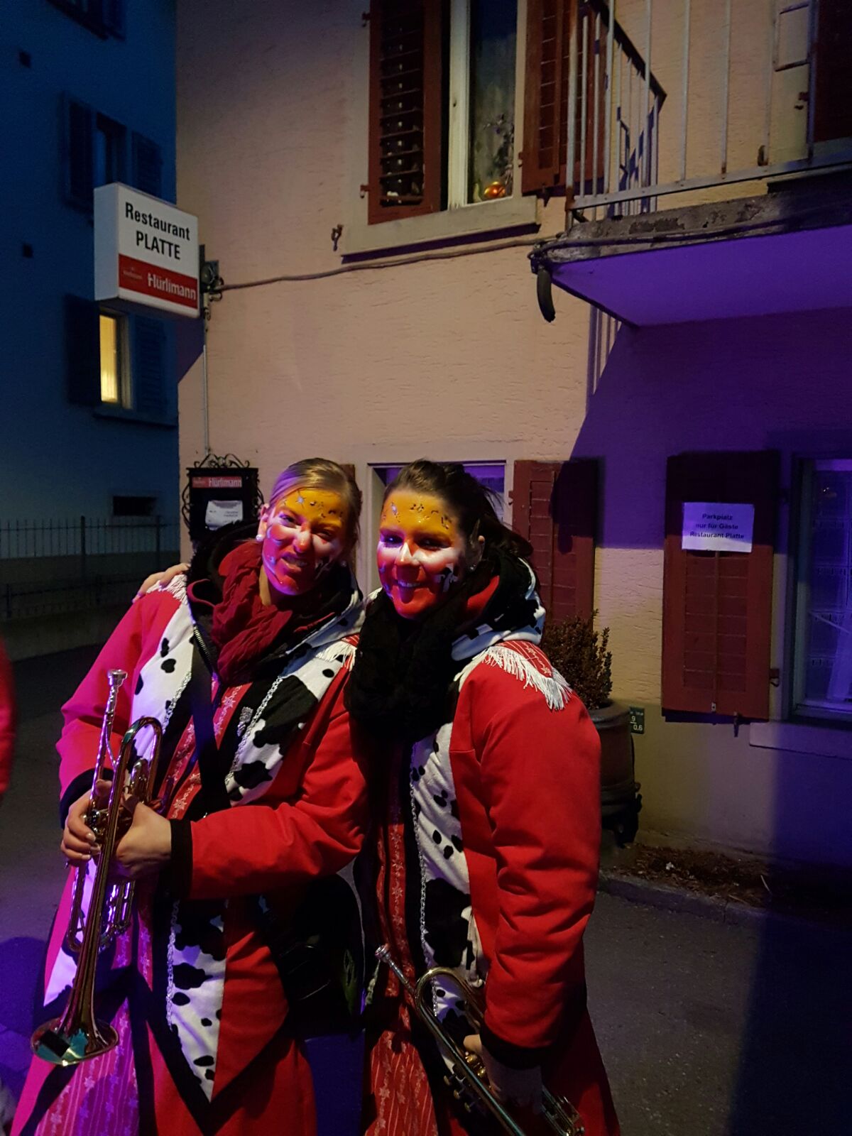 Am 7i isch äs losgange mit schminke. Wo mer dänn alli Farb im Gsicht gha händ hät eusi Heimfasnacht chöne losgah. Am 9i isch euse ersti Uftritt im Hirschesaal gsi. Chum isch er fertig gsi, hämer eusi Instrument id Autos glade und sind uf Steg is Restaurant Lenze go spiele.