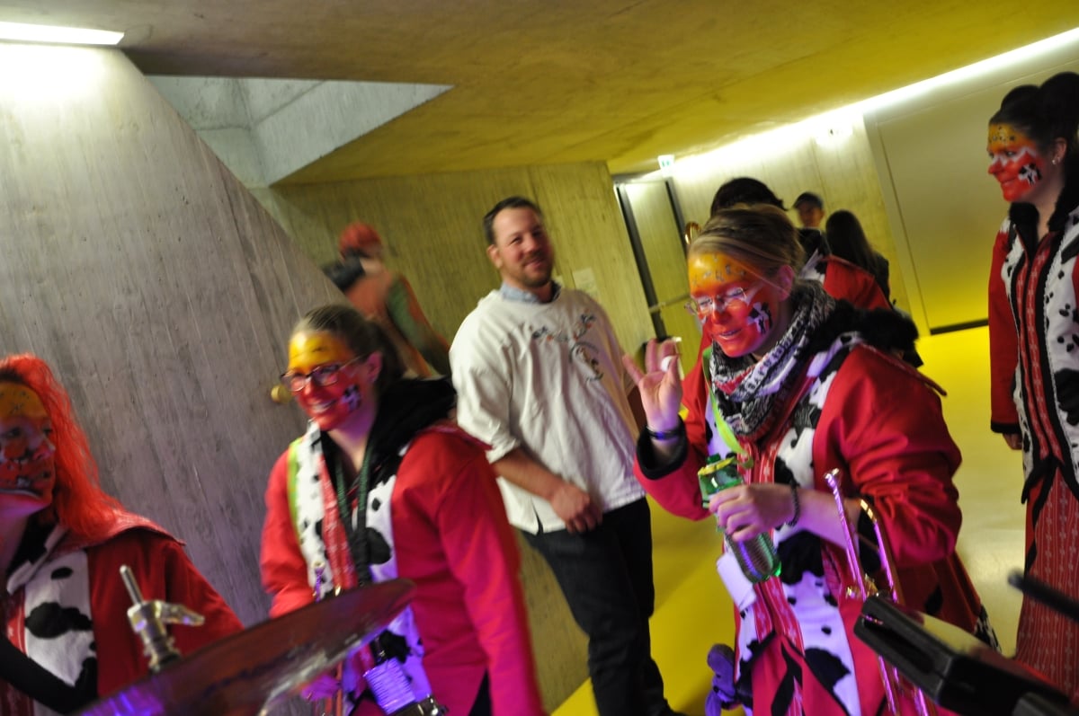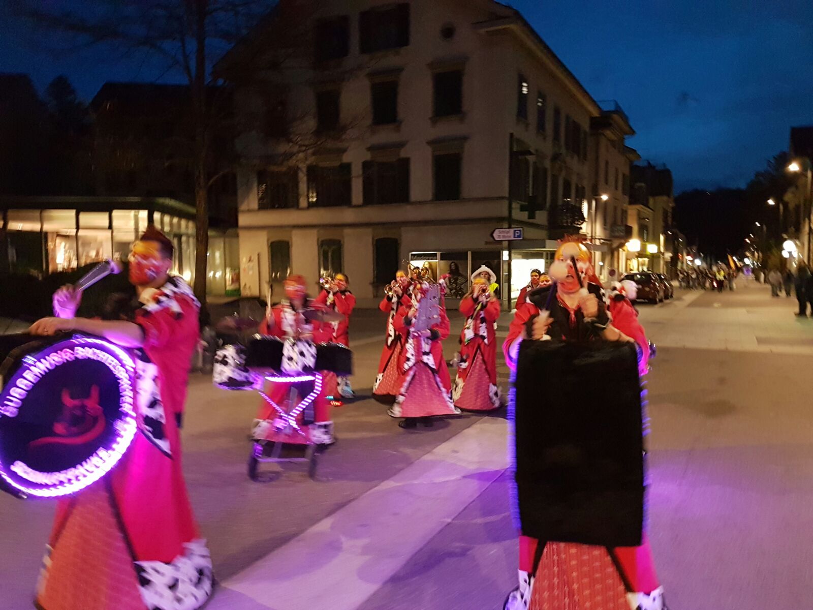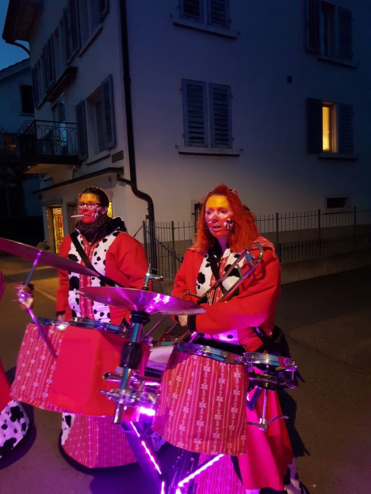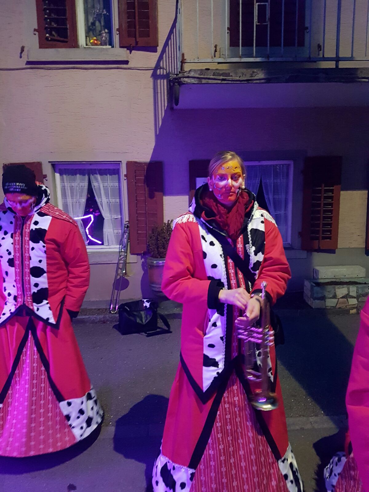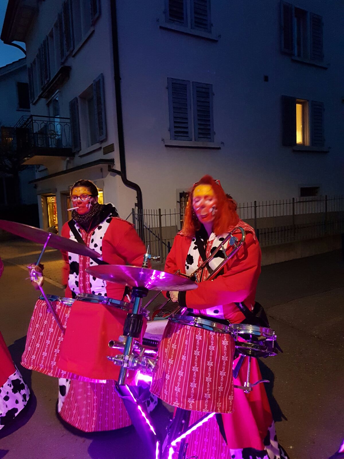 Am 7i isch äs losgange mit schminke. Wo mer dänn alli Farb im Gsicht gha händ hät eusi Heimfasnacht chöne losgah. Am 9i isch euse ersti Uftritt im Hirschesaal gsi. Chum isch er fertig gsi, hämer eusi Instrument id Autos glade und sind uf Steg is Restaurant Lenze go spiele.