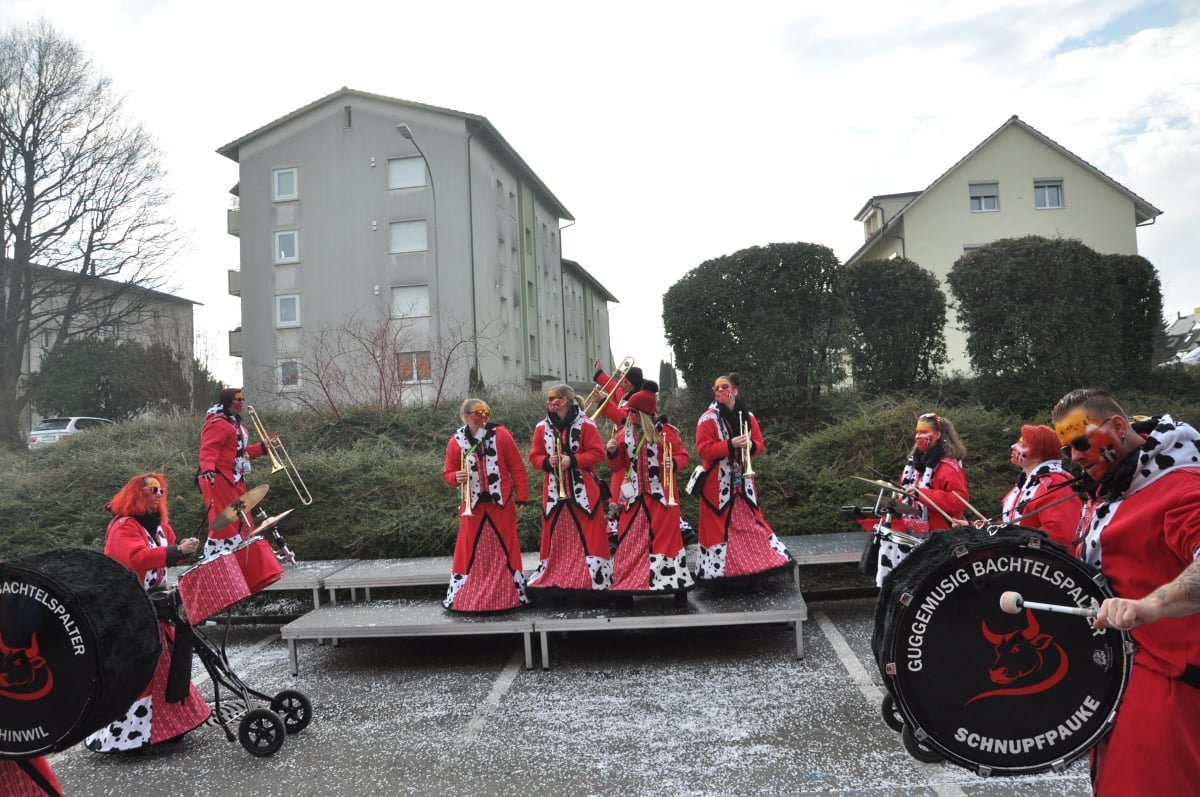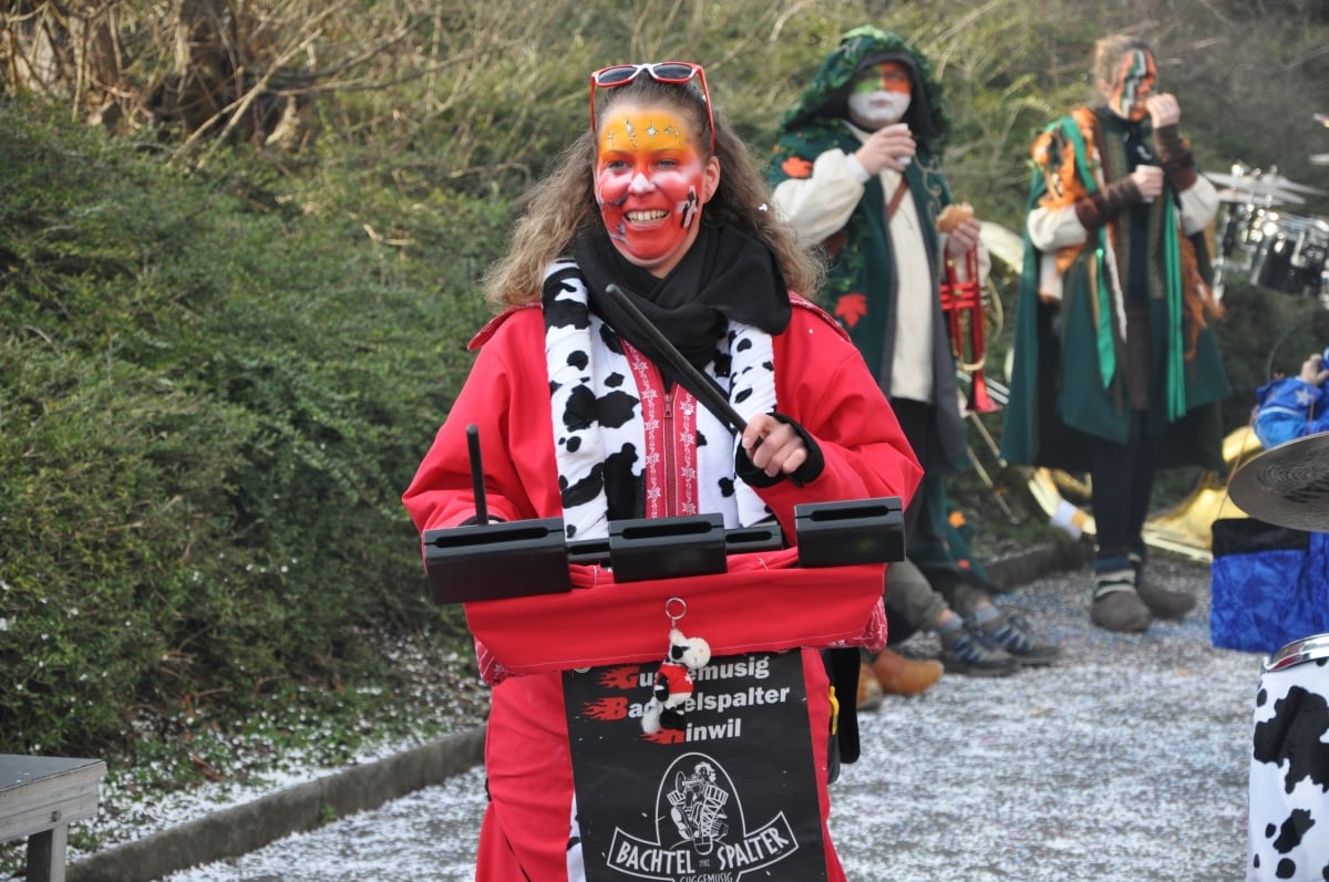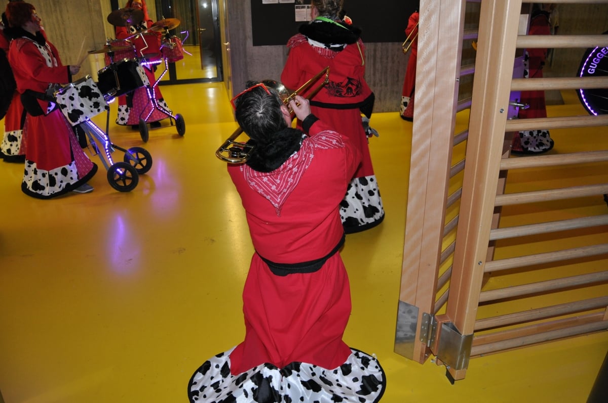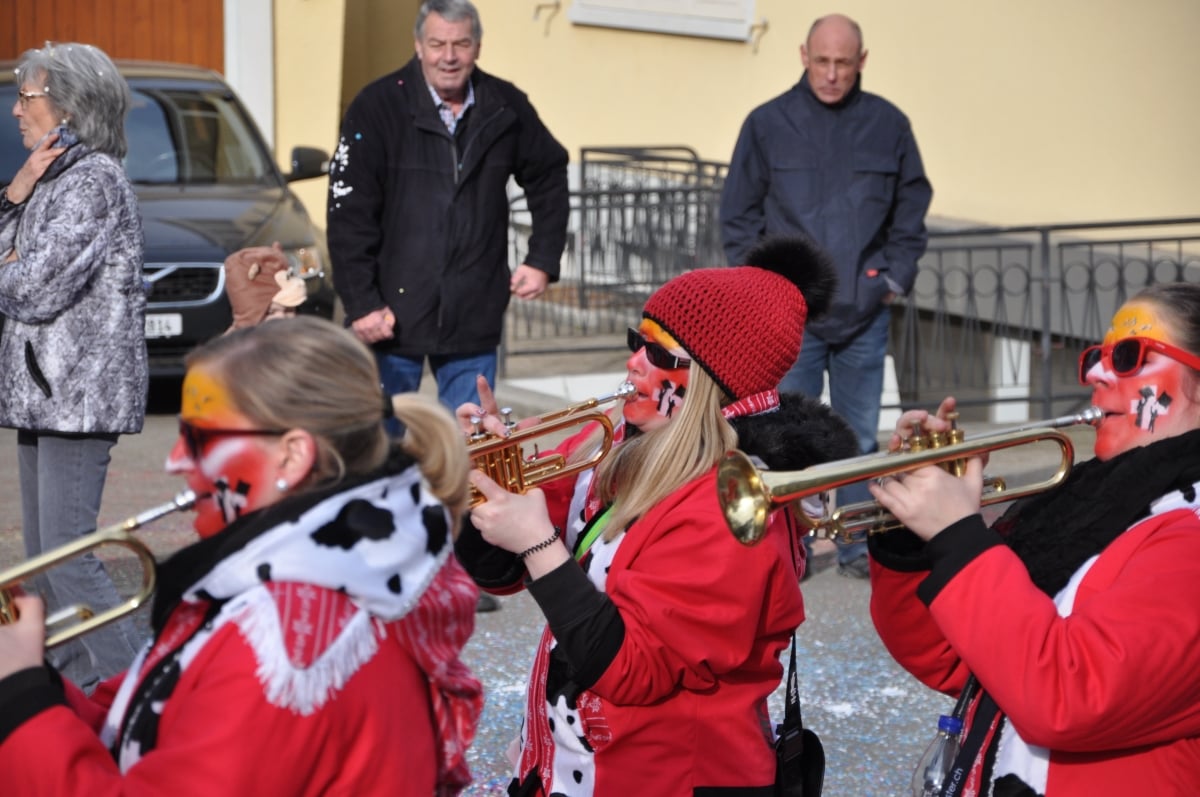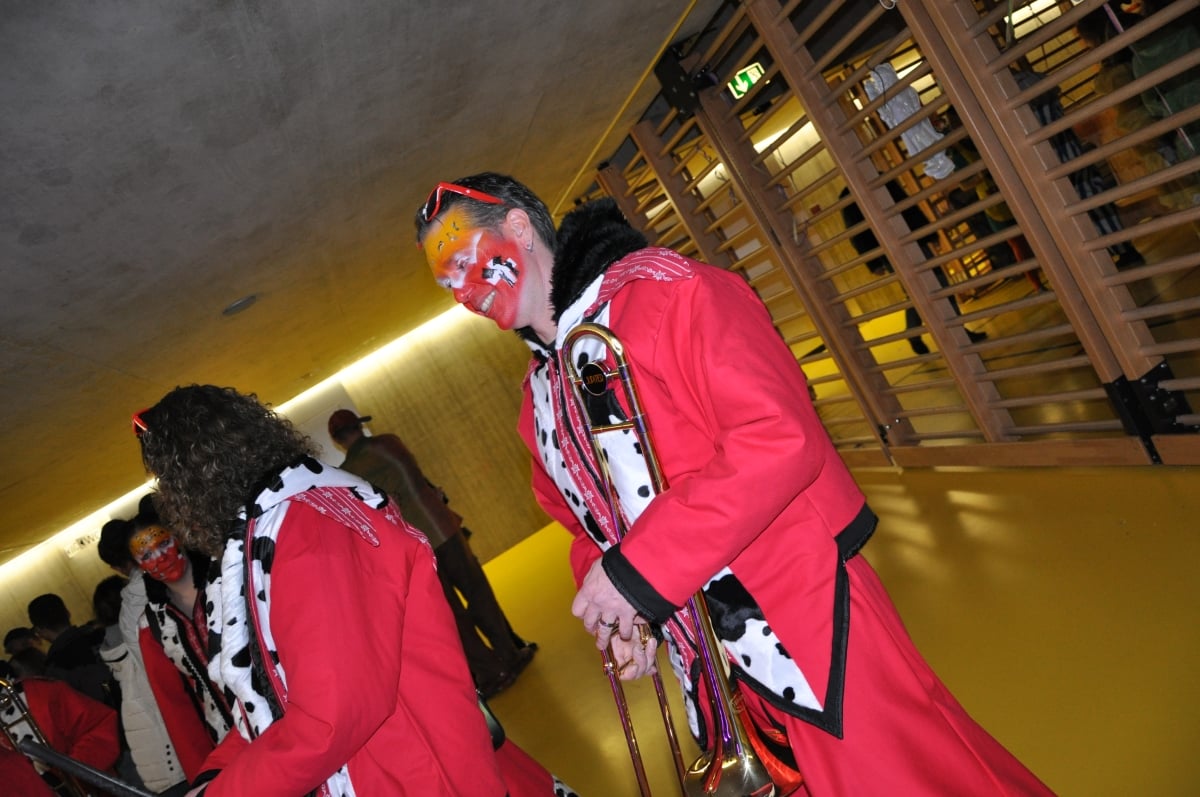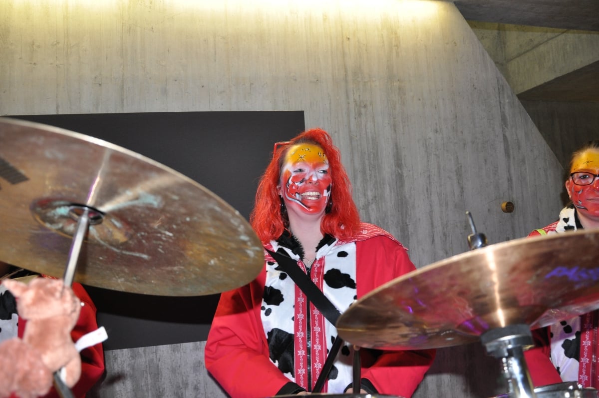 Am 7i isch äs losgange mit schminke. Wo mer dänn alli Farb im Gsicht gha händ hät eusi Heimfasnacht chöne losgah. Am 9i isch euse ersti Uftritt im Hirschesaal gsi. Chum isch er fertig gsi, hämer eusi Instrument id Autos glade und sind uf Steg is Restaurant Lenze go spiele.
