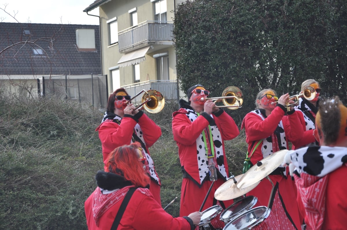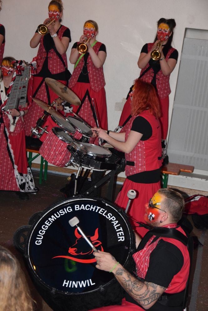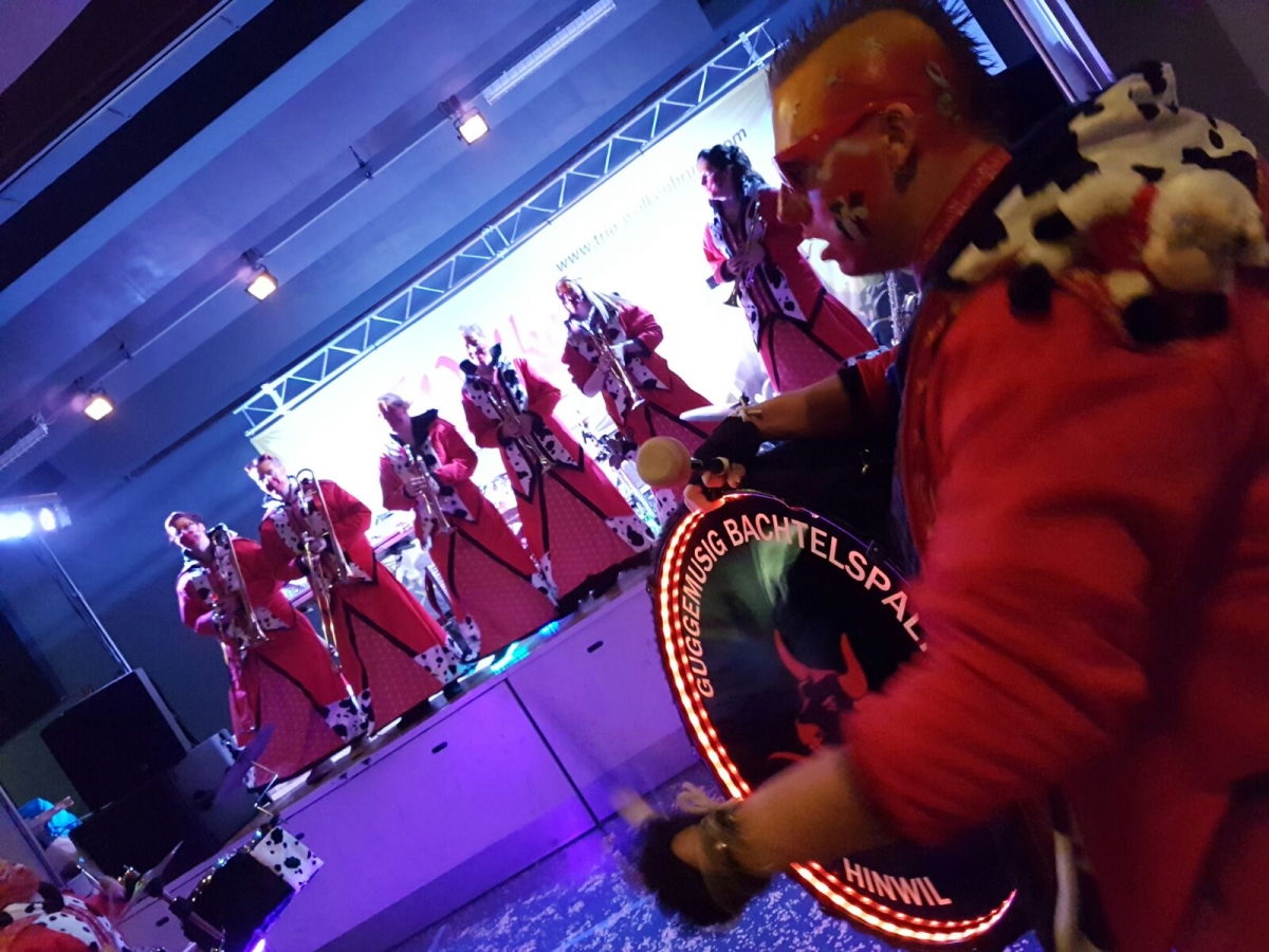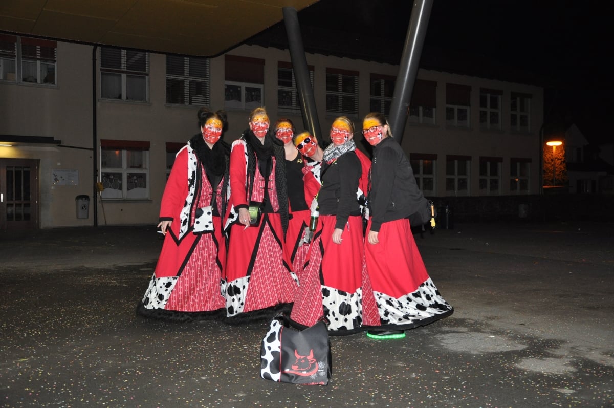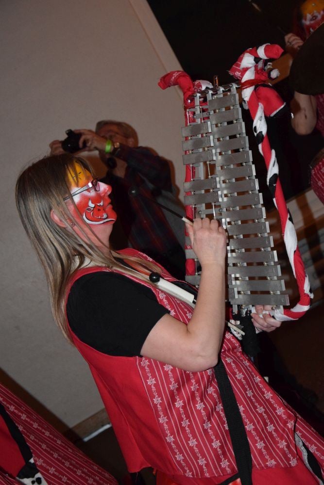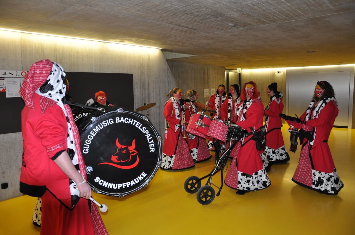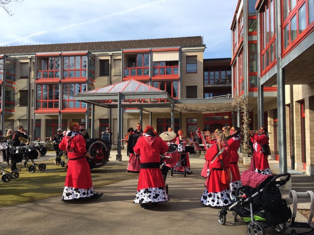 Am 7i isch äs losgange mit schminke. Wo mer dänn alli Farb im Gsicht gha händ hät eusi Heimfasnacht chöne losgah. Am 9i isch euse ersti Uftritt im Hirschesaal gsi. Chum isch er fertig gsi, hämer eusi Instrument id Autos glade und sind uf Steg is Restaurant Lenze go spiele.
