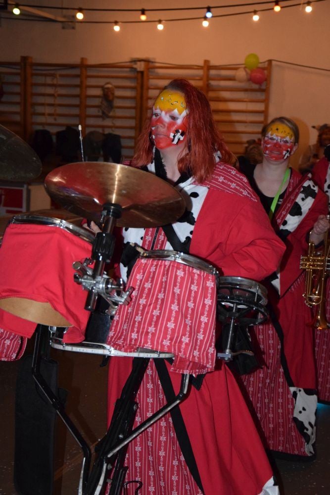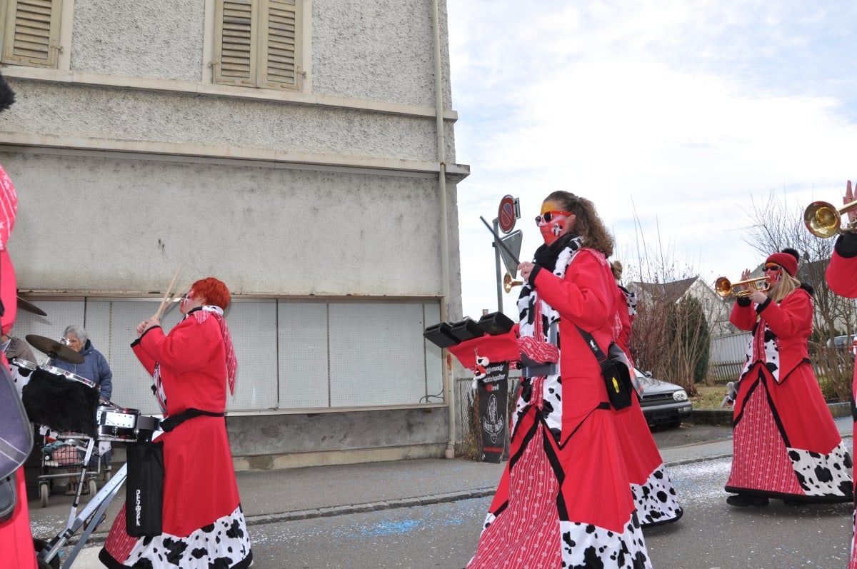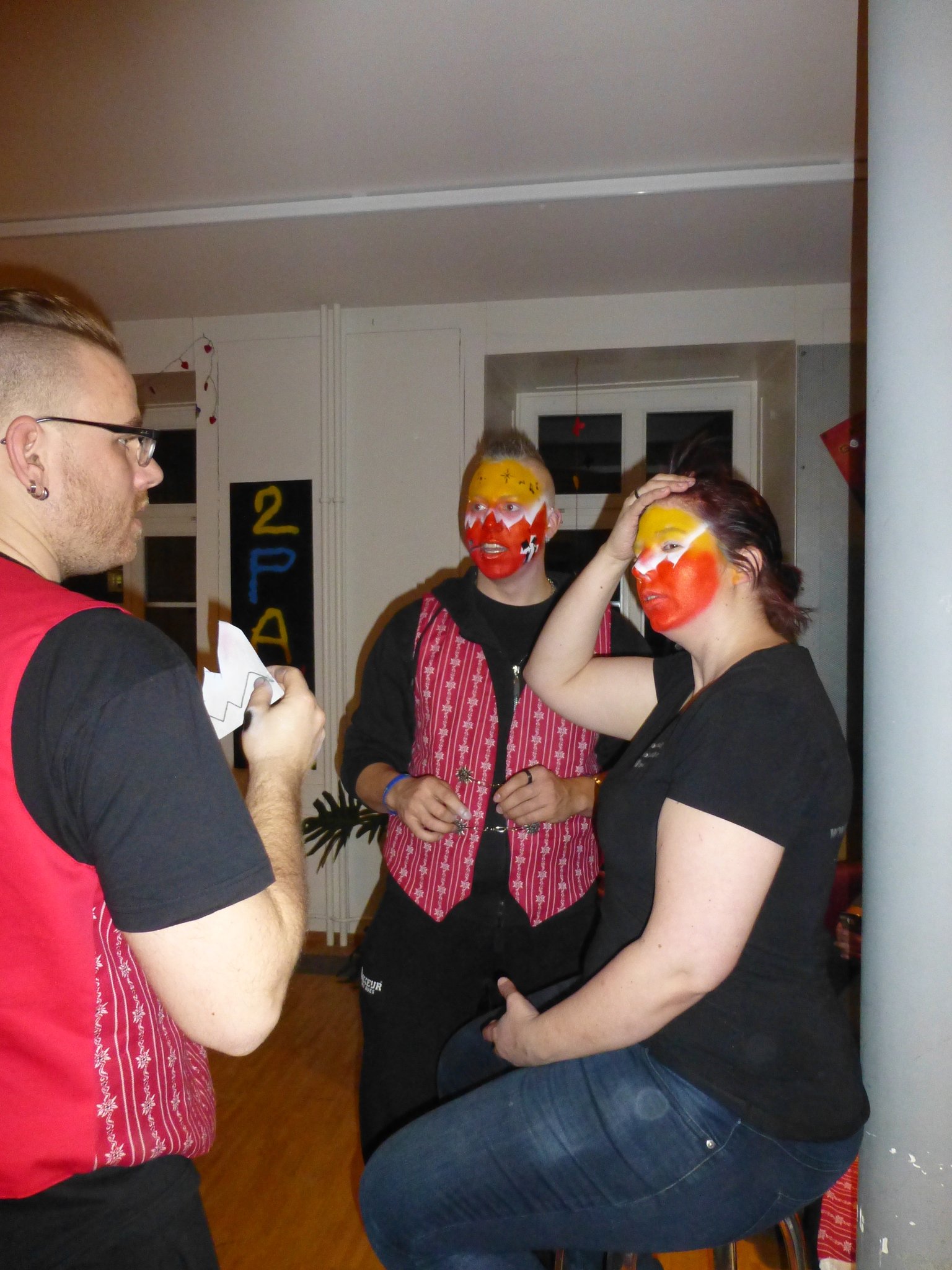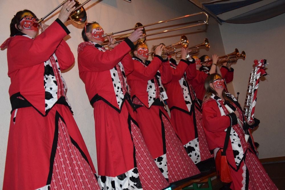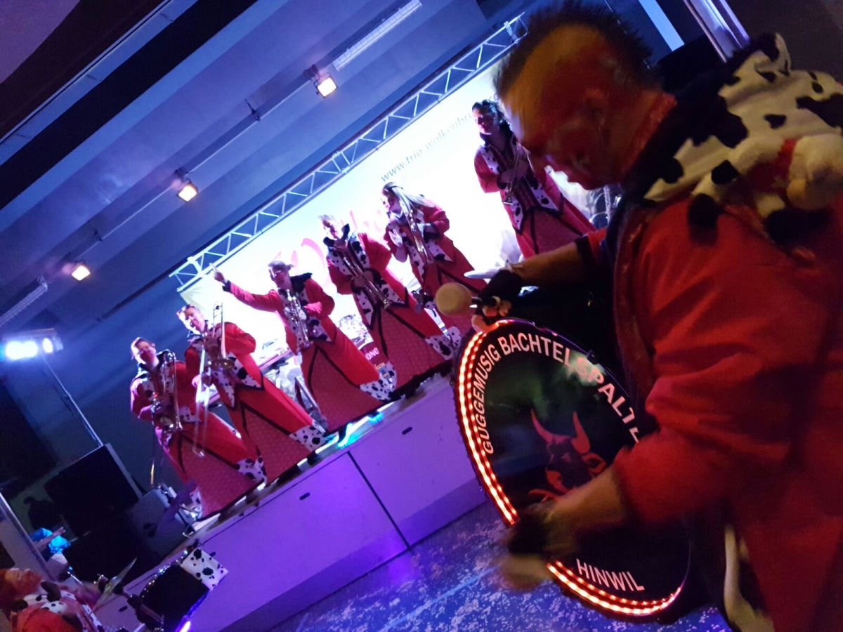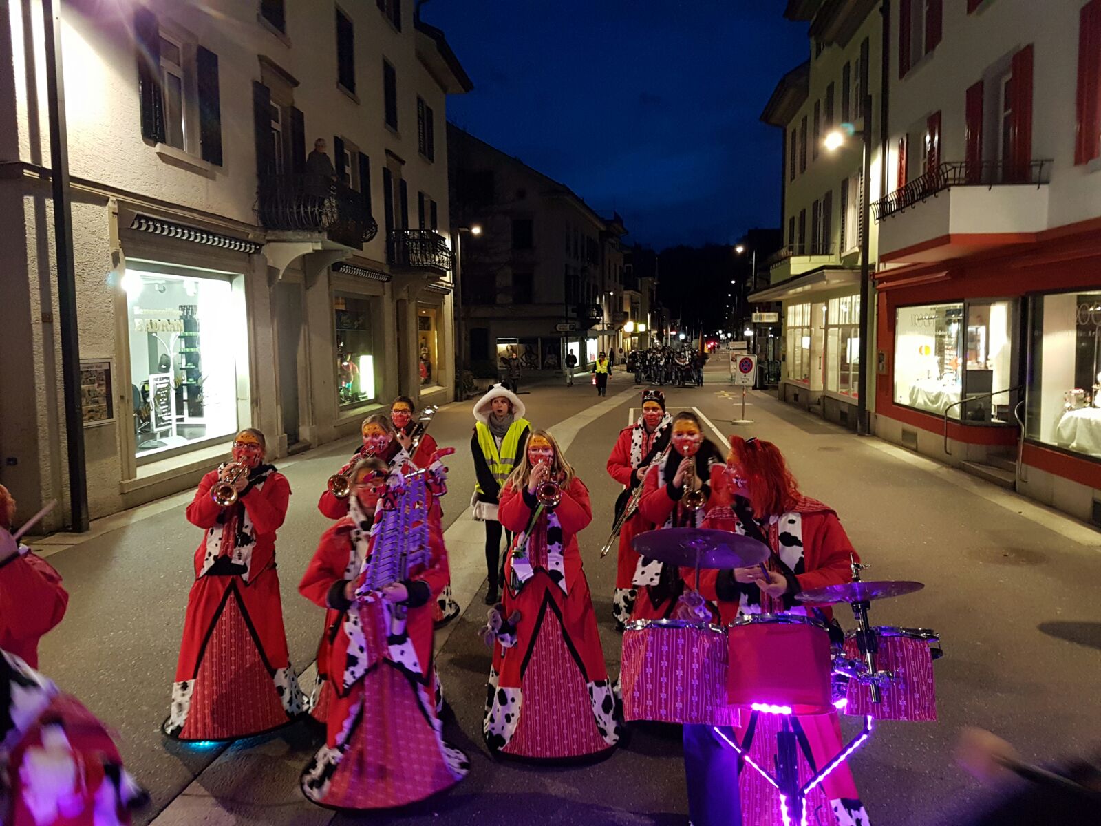 Am 7i isch äs losgange mit schminke. Wo mer dänn alli Farb im Gsicht gha händ hät eusi Heimfasnacht chöne losgah. Am 9i isch euse ersti Uftritt im Hirschesaal gsi. Chum isch er fertig gsi, hämer eusi Instrument id Autos glade und sind uf Steg is Restaurant Lenze go spiele.