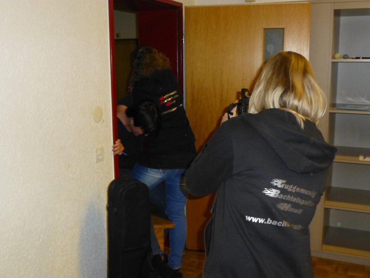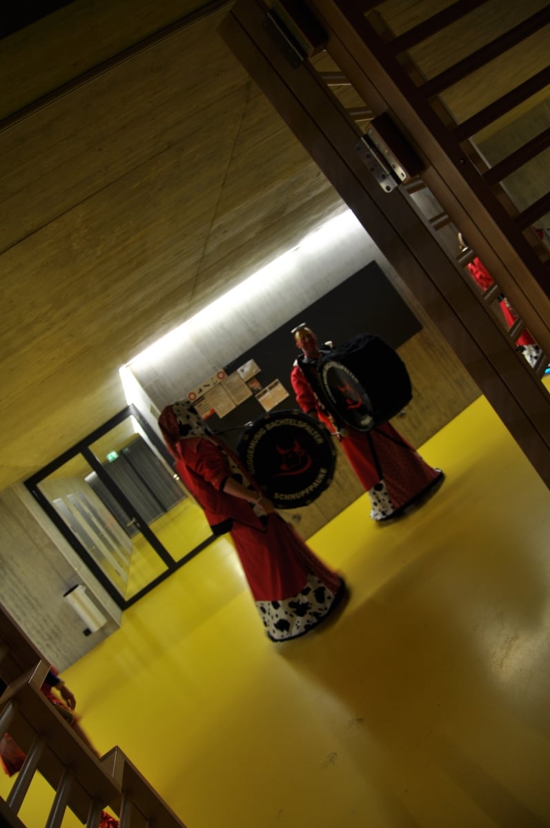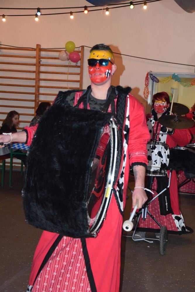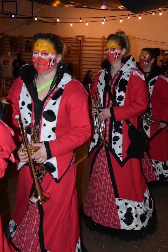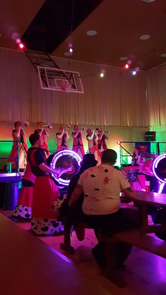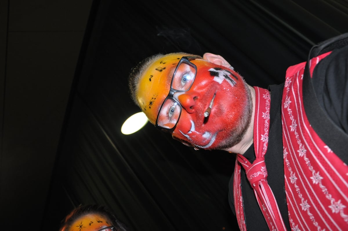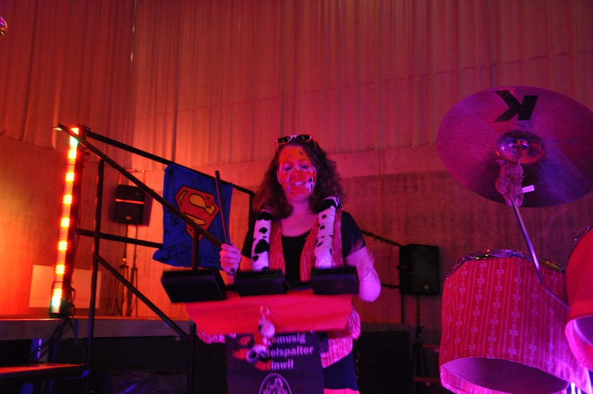 Am 7i isch äs losgange mit schminke. Wo mer dänn alli Farb im Gsicht gha händ hät eusi Heimfasnacht chöne losgah. Am 9i isch euse ersti Uftritt im Hirschesaal gsi. Chum isch er fertig gsi, hämer eusi Instrument id Autos glade und sind uf Steg is Restaurant Lenze go spiele.