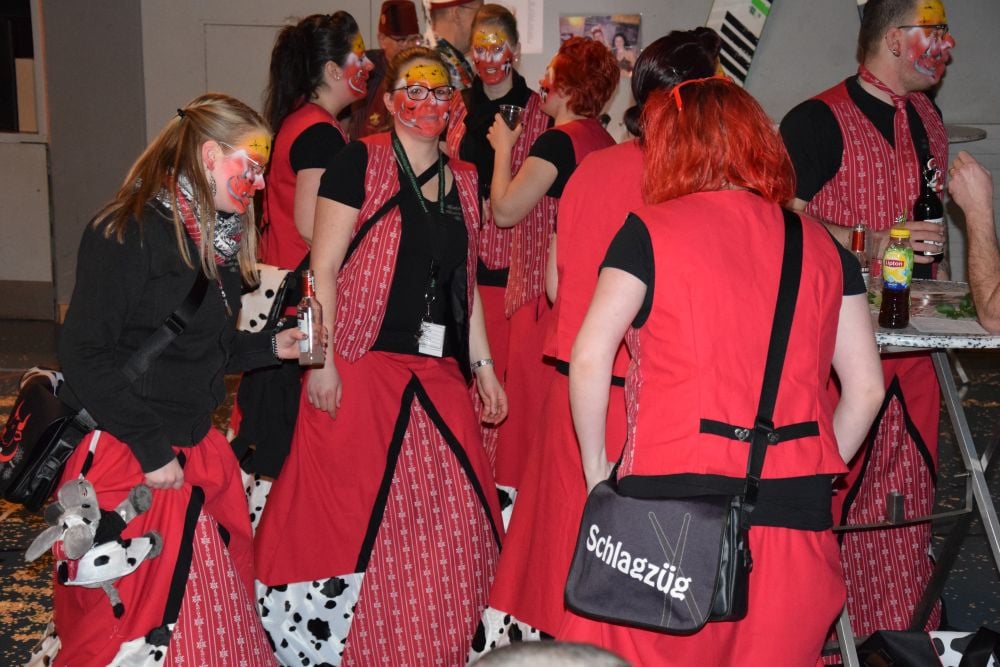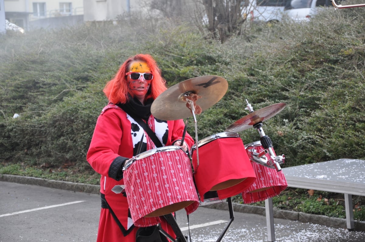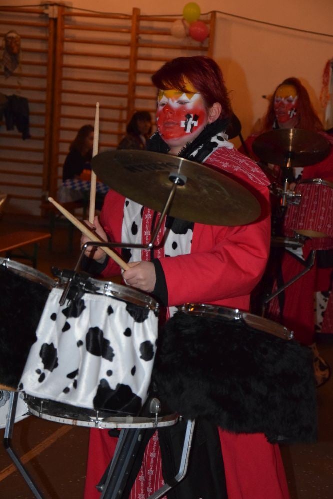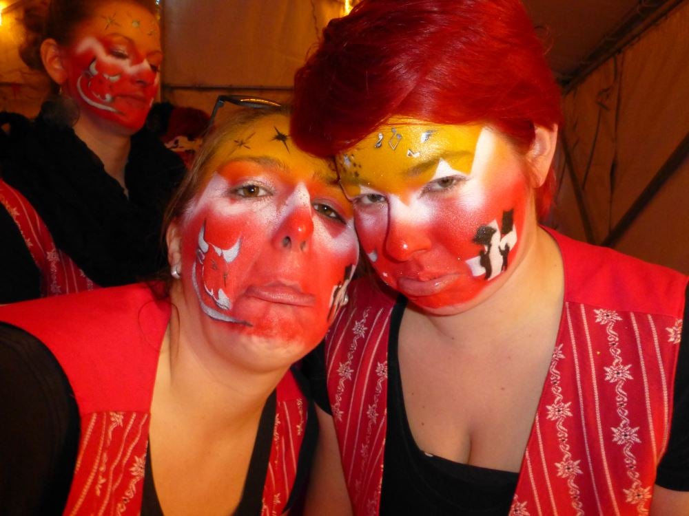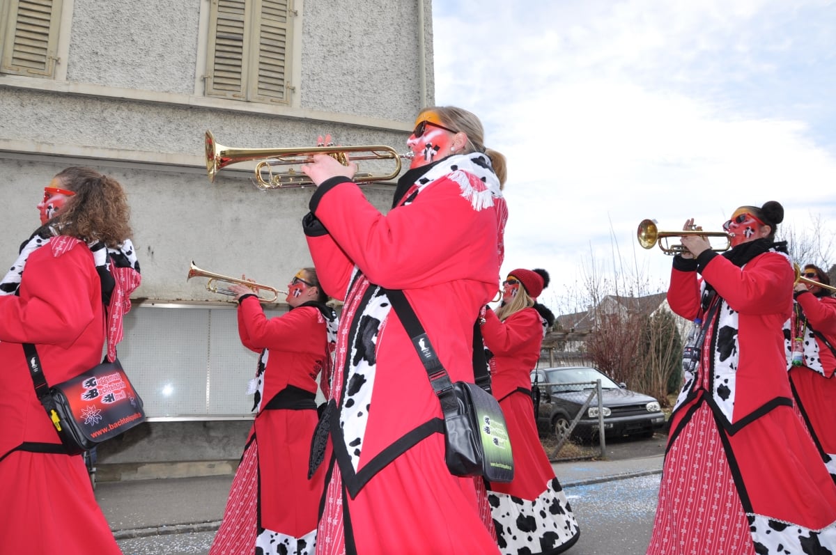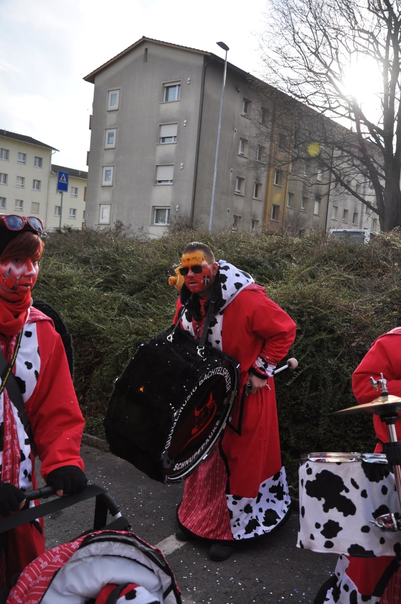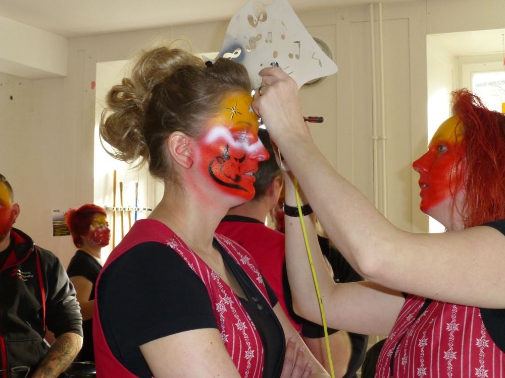 Am 7i isch äs losgange mit schminke. Wo mer dänn alli Farb im Gsicht gha händ hät eusi Heimfasnacht chöne losgah. Am 9i isch euse ersti Uftritt im Hirschesaal gsi. Chum isch er fertig gsi, hämer eusi Instrument id Autos glade und sind uf Steg is Restaurant Lenze go spiele.