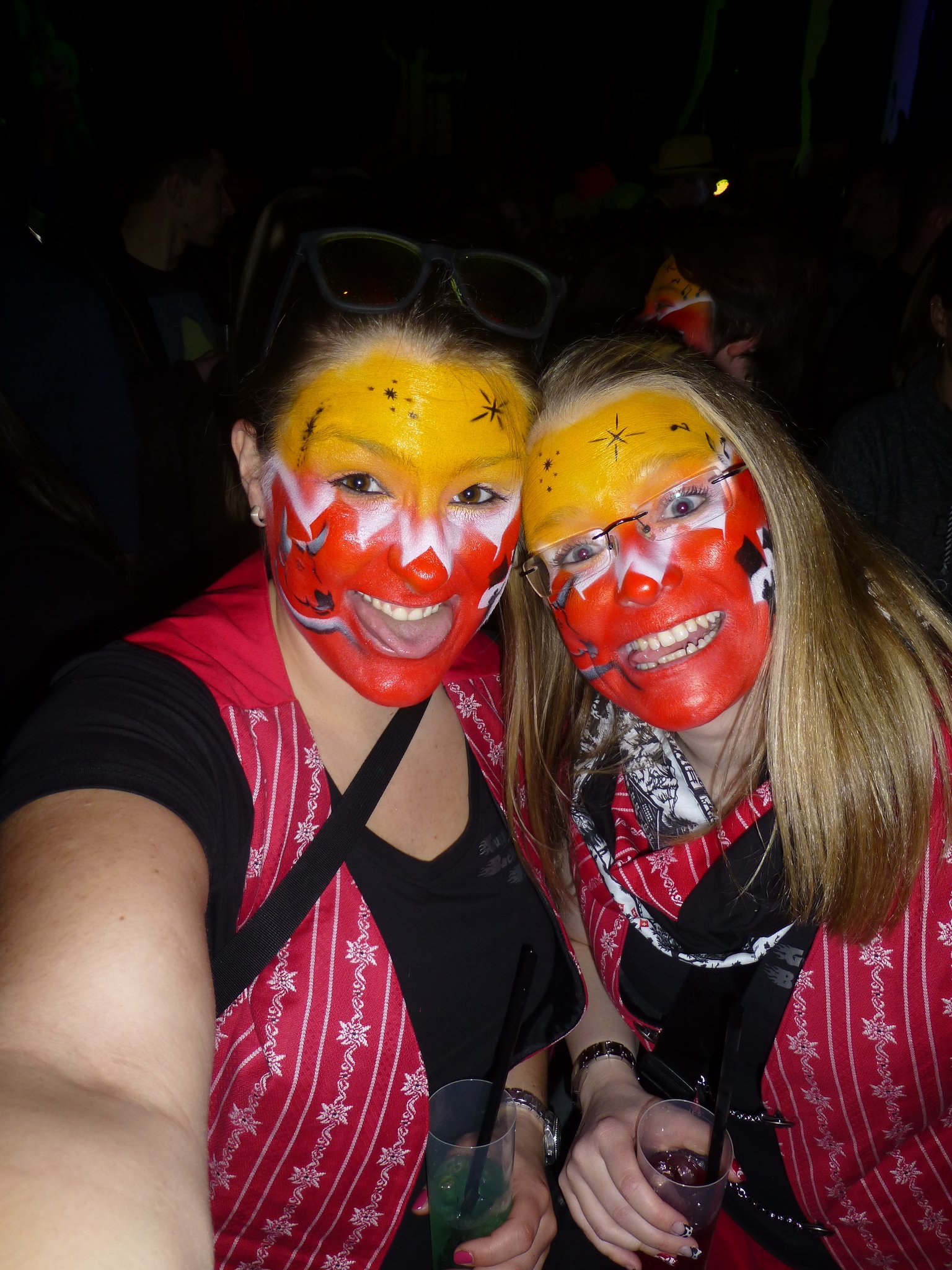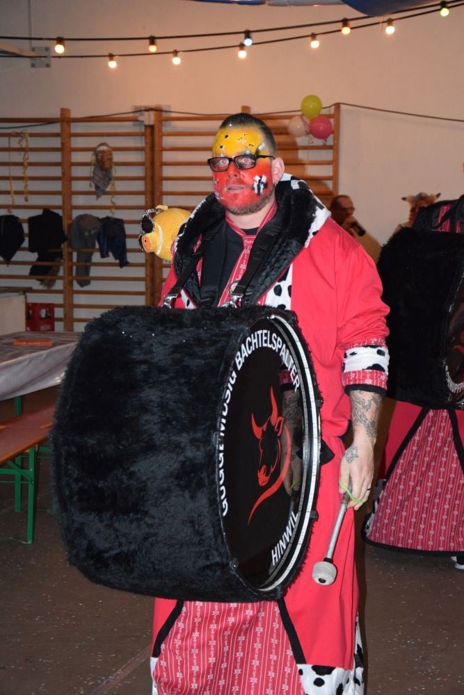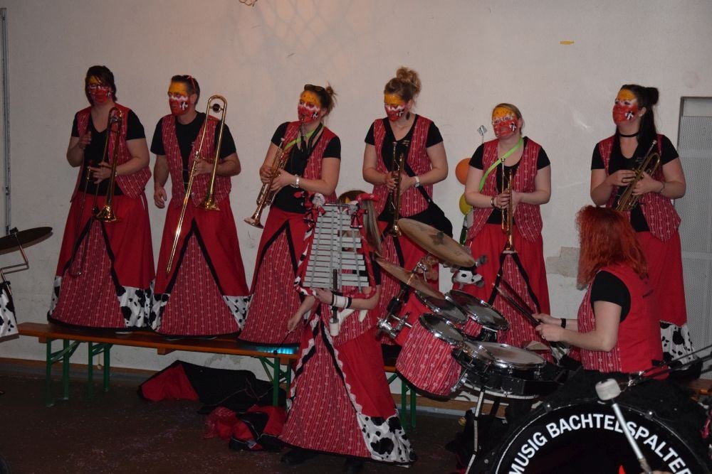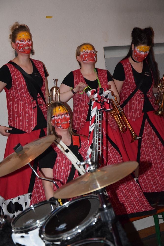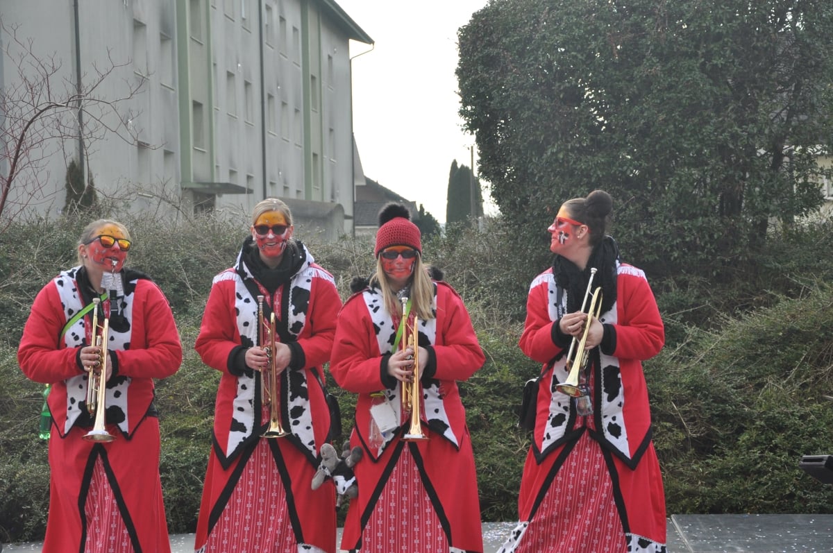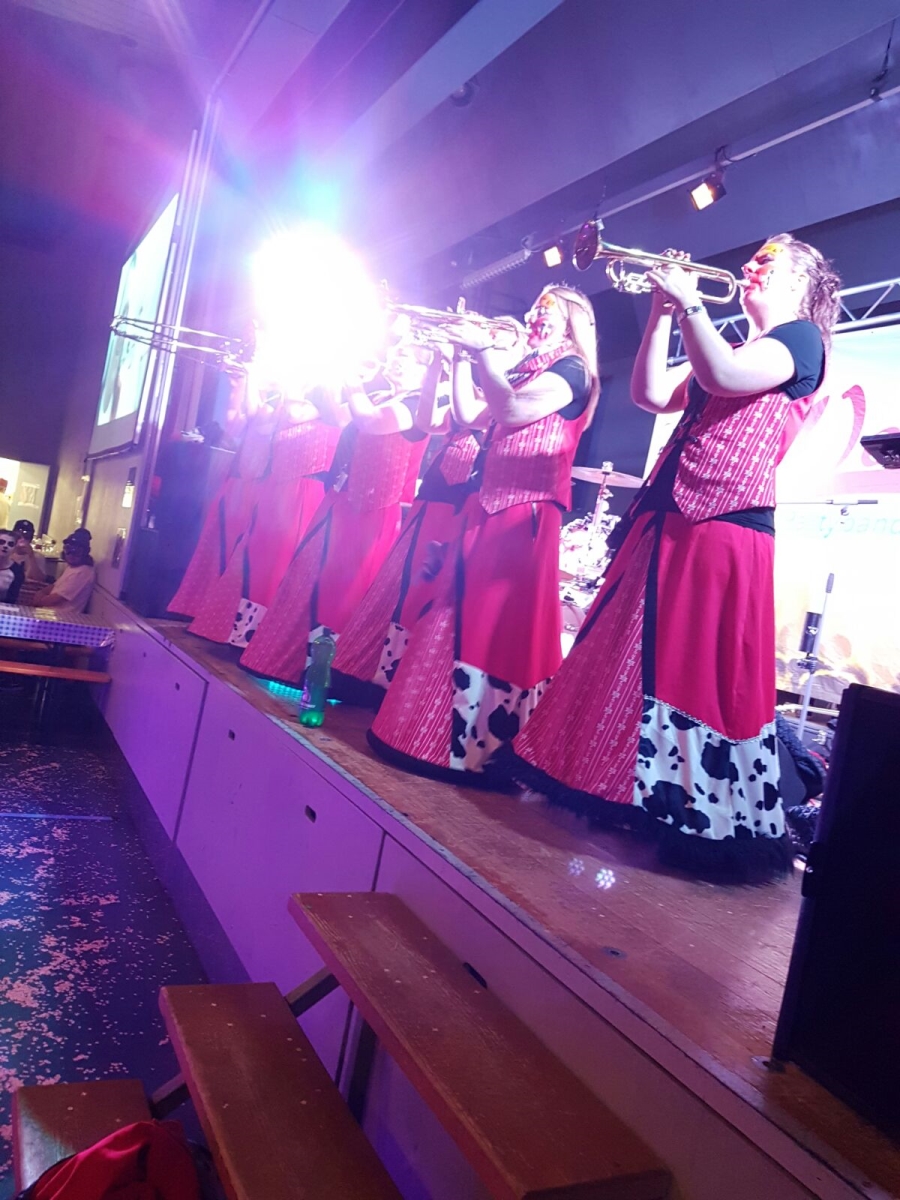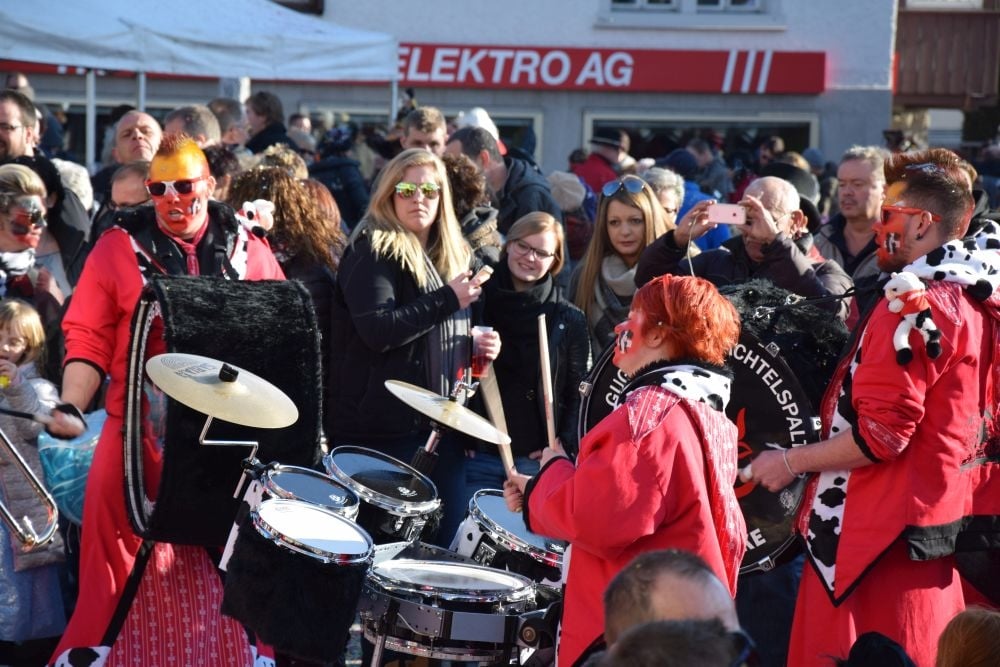 Am 7i isch äs losgange mit schminke. Wo mer dänn alli Farb im Gsicht gha händ hät eusi Heimfasnacht chöne losgah. Am 9i isch euse ersti Uftritt im Hirschesaal gsi. Chum isch er fertig gsi, hämer eusi Instrument id Autos glade und sind uf Steg is Restaurant Lenze go spiele.