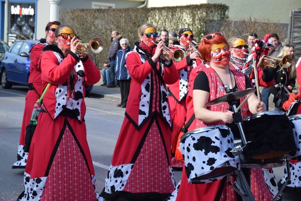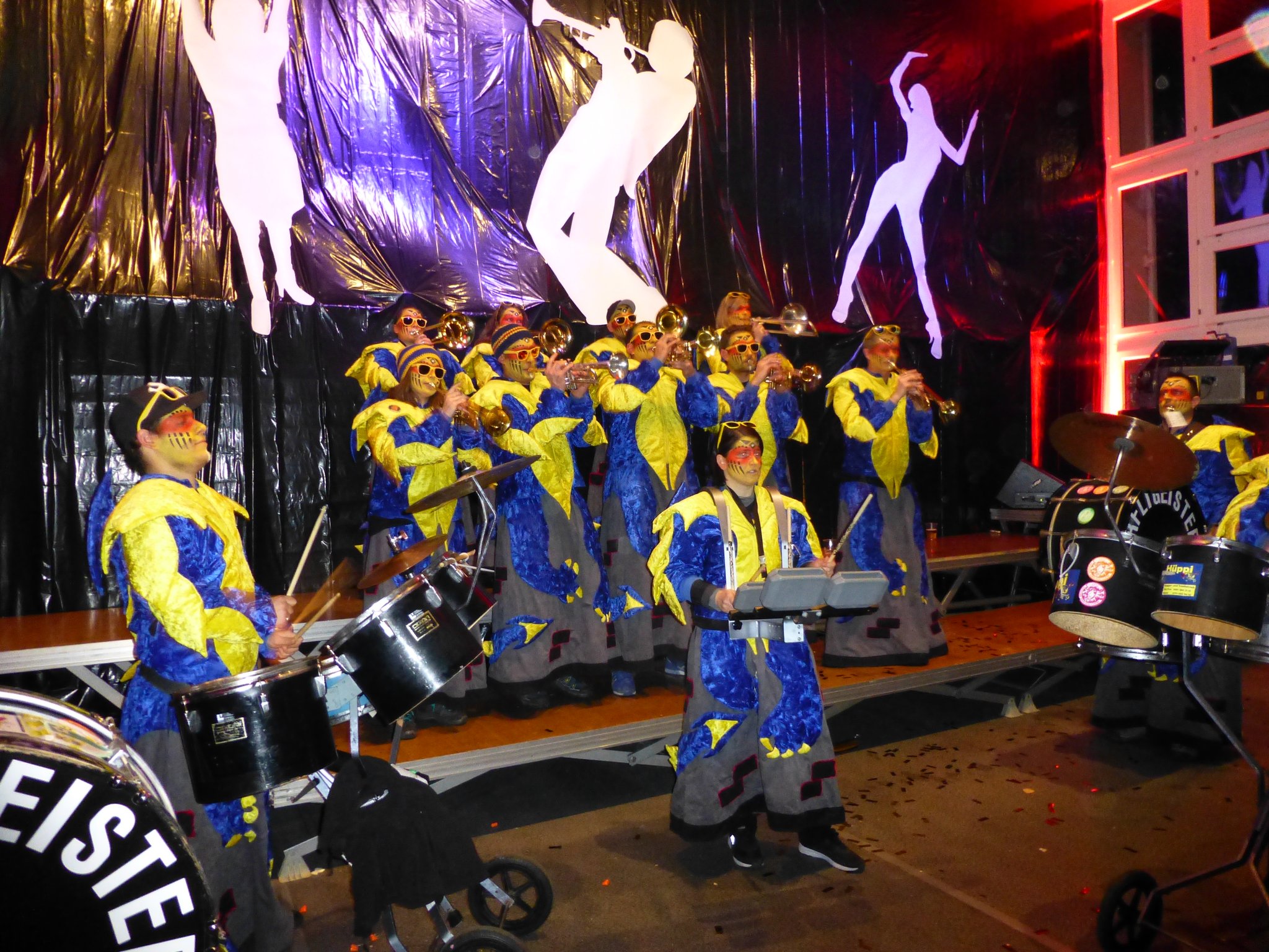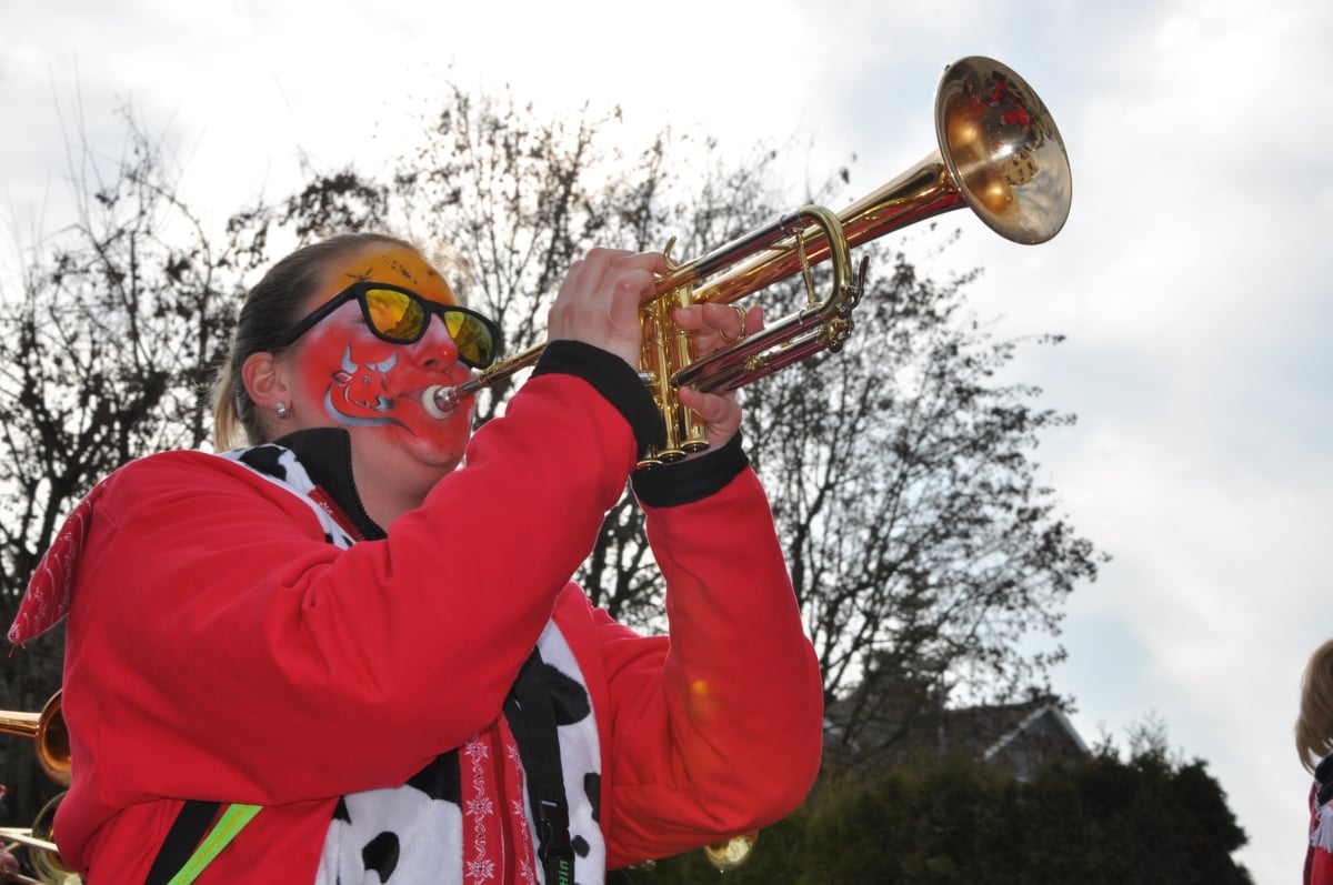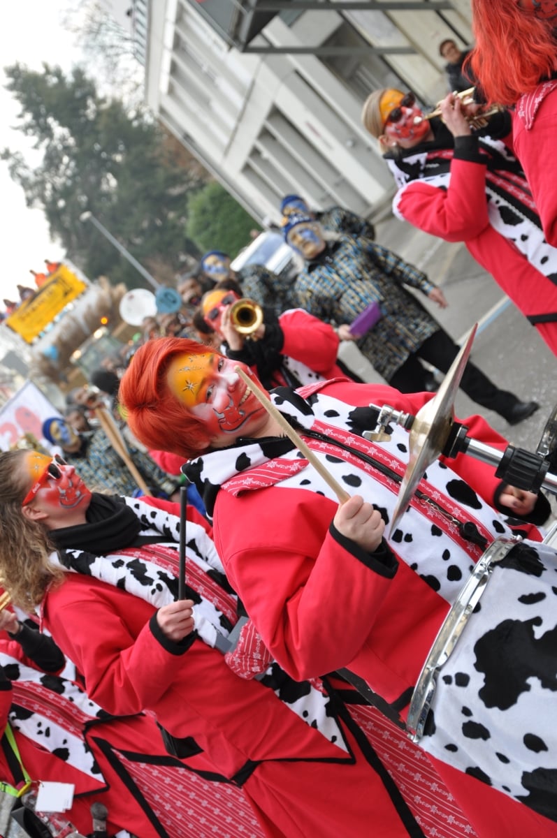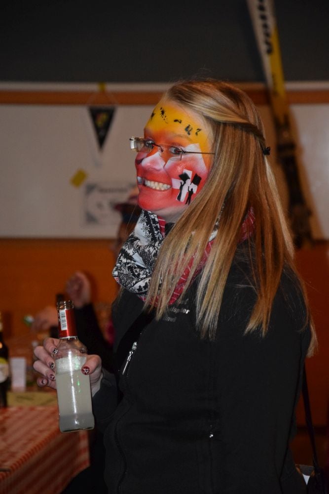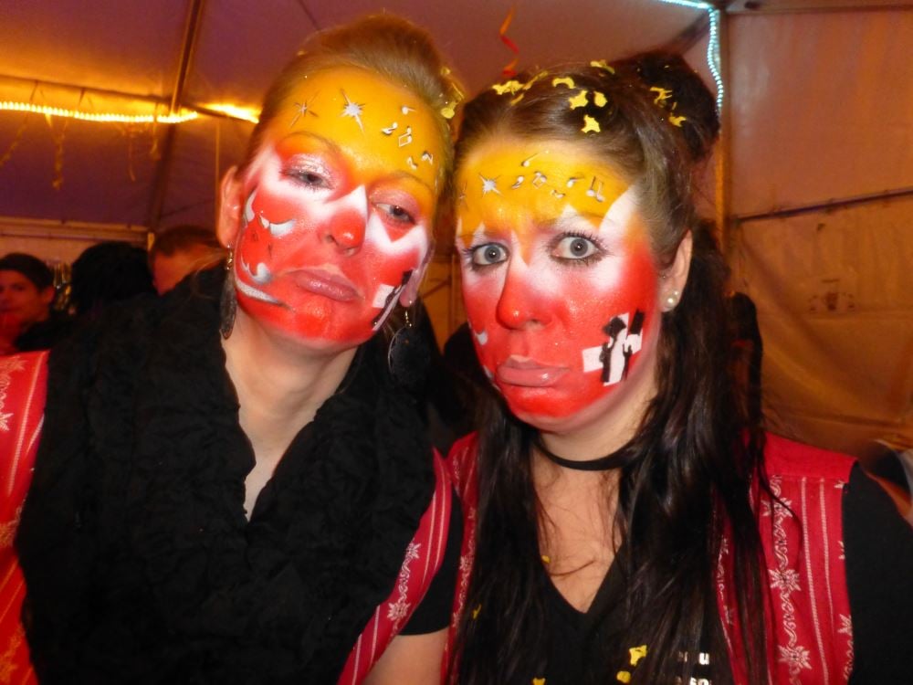 Am 7i isch äs losgange mit schminke. Wo mer dänn alli Farb im Gsicht gha händ hät eusi Heimfasnacht chöne losgah. Am 9i isch euse ersti Uftritt im Hirschesaal gsi. Chum isch er fertig gsi, hämer eusi Instrument id Autos glade und sind uf Steg is Restaurant Lenze go spiele.