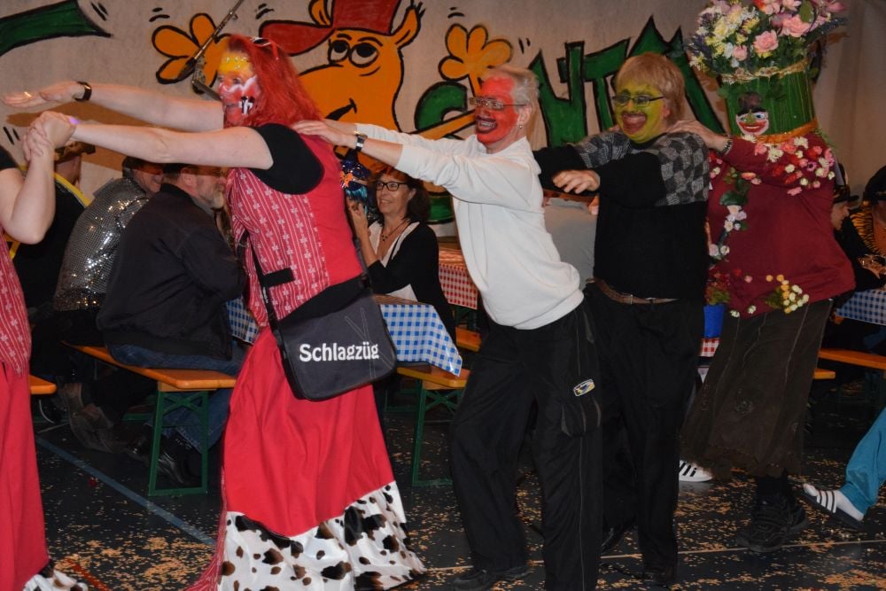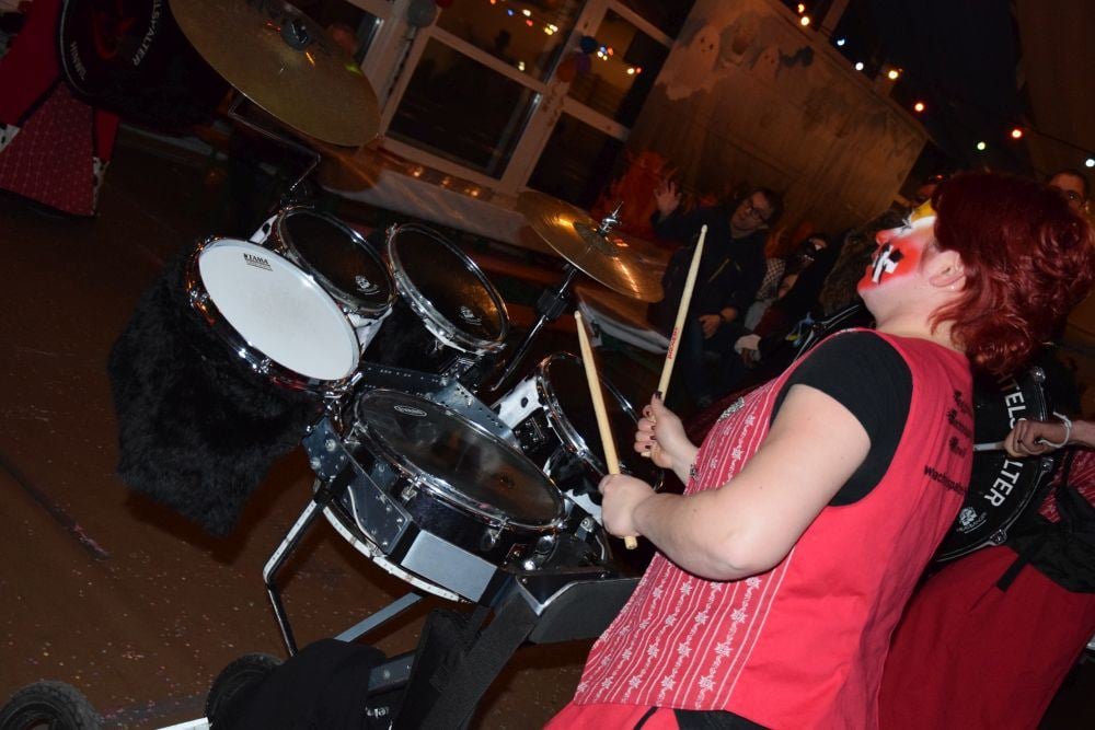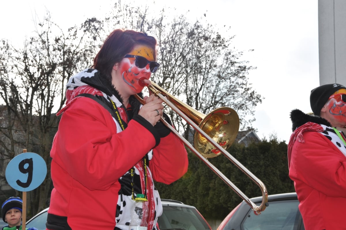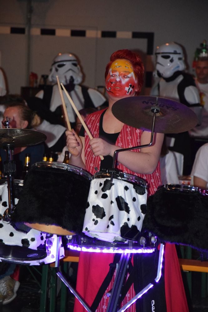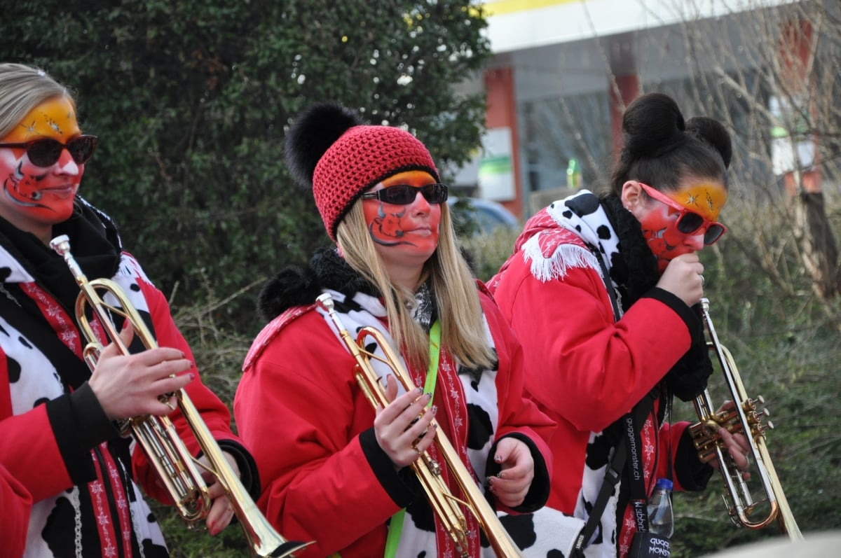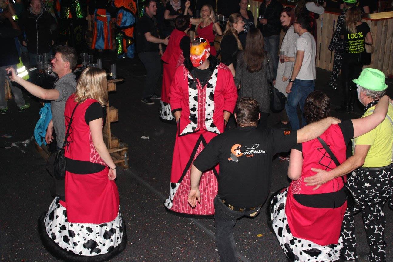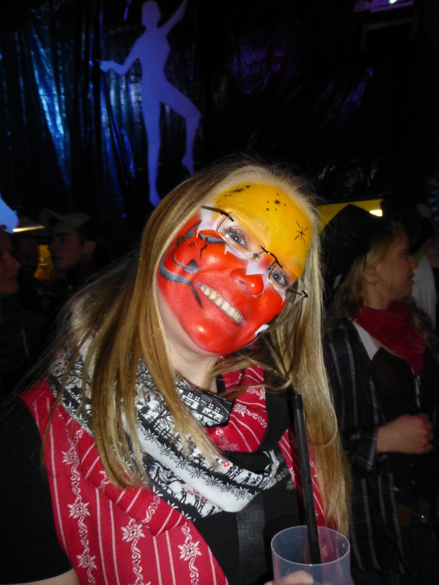 Am 7i isch äs losgange mit schminke. Wo mer dänn alli Farb im Gsicht gha händ hät eusi Heimfasnacht chöne losgah. Am 9i isch euse ersti Uftritt im Hirschesaal gsi. Chum isch er fertig gsi, hämer eusi Instrument id Autos glade und sind uf Steg is Restaurant Lenze go spiele.