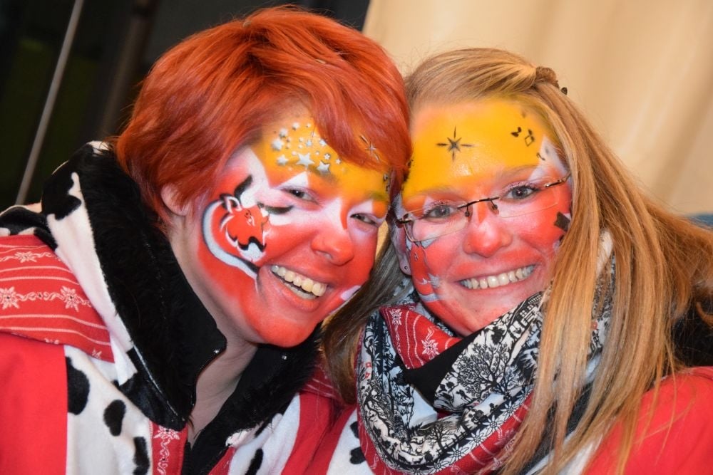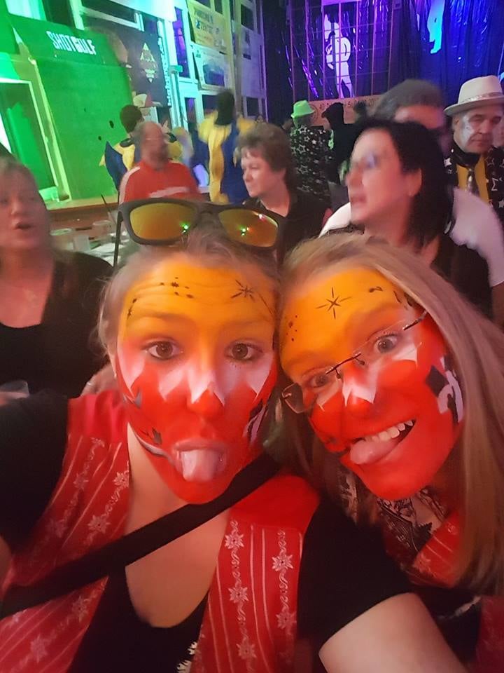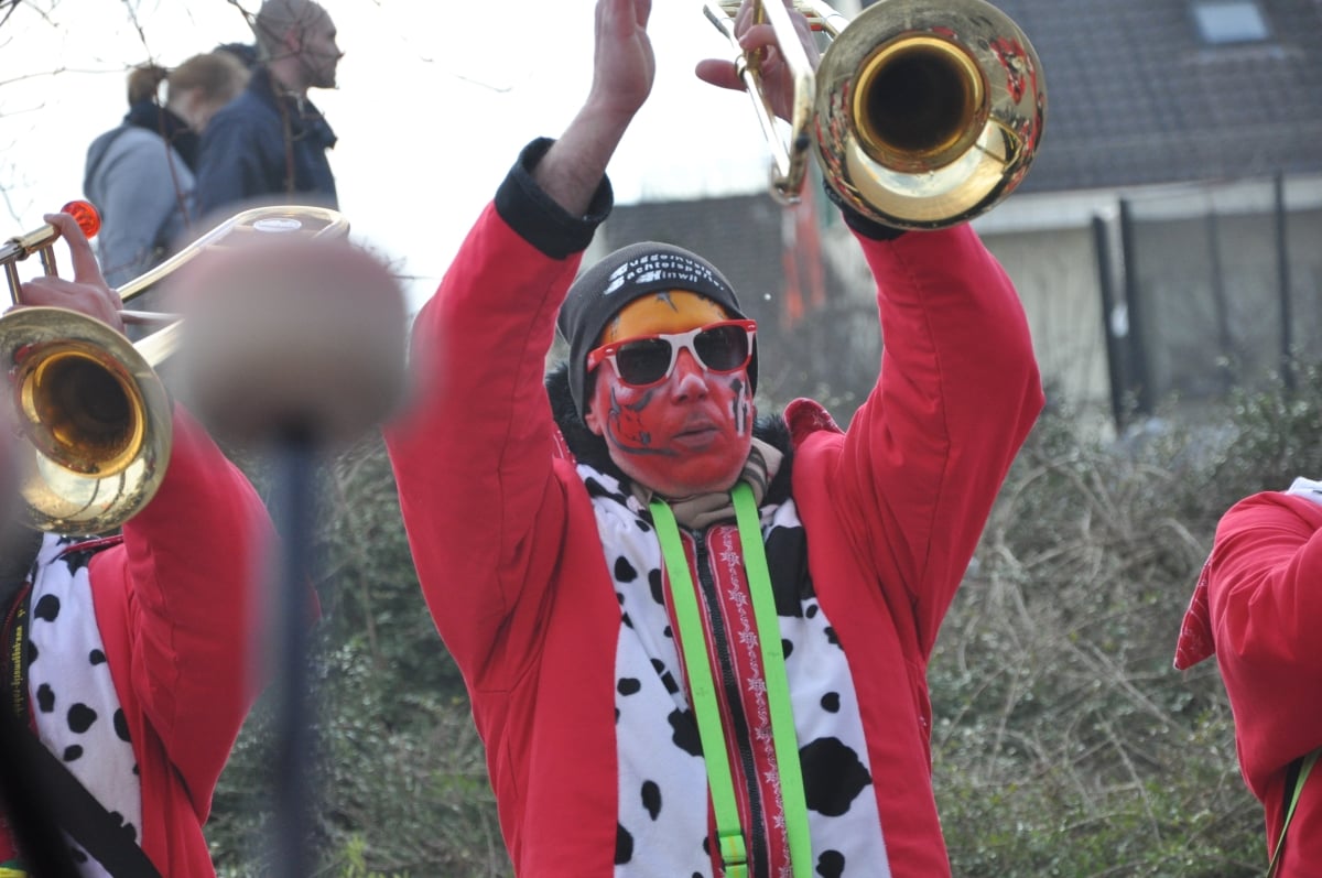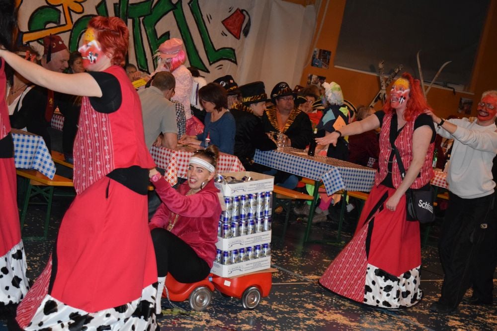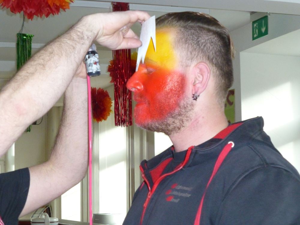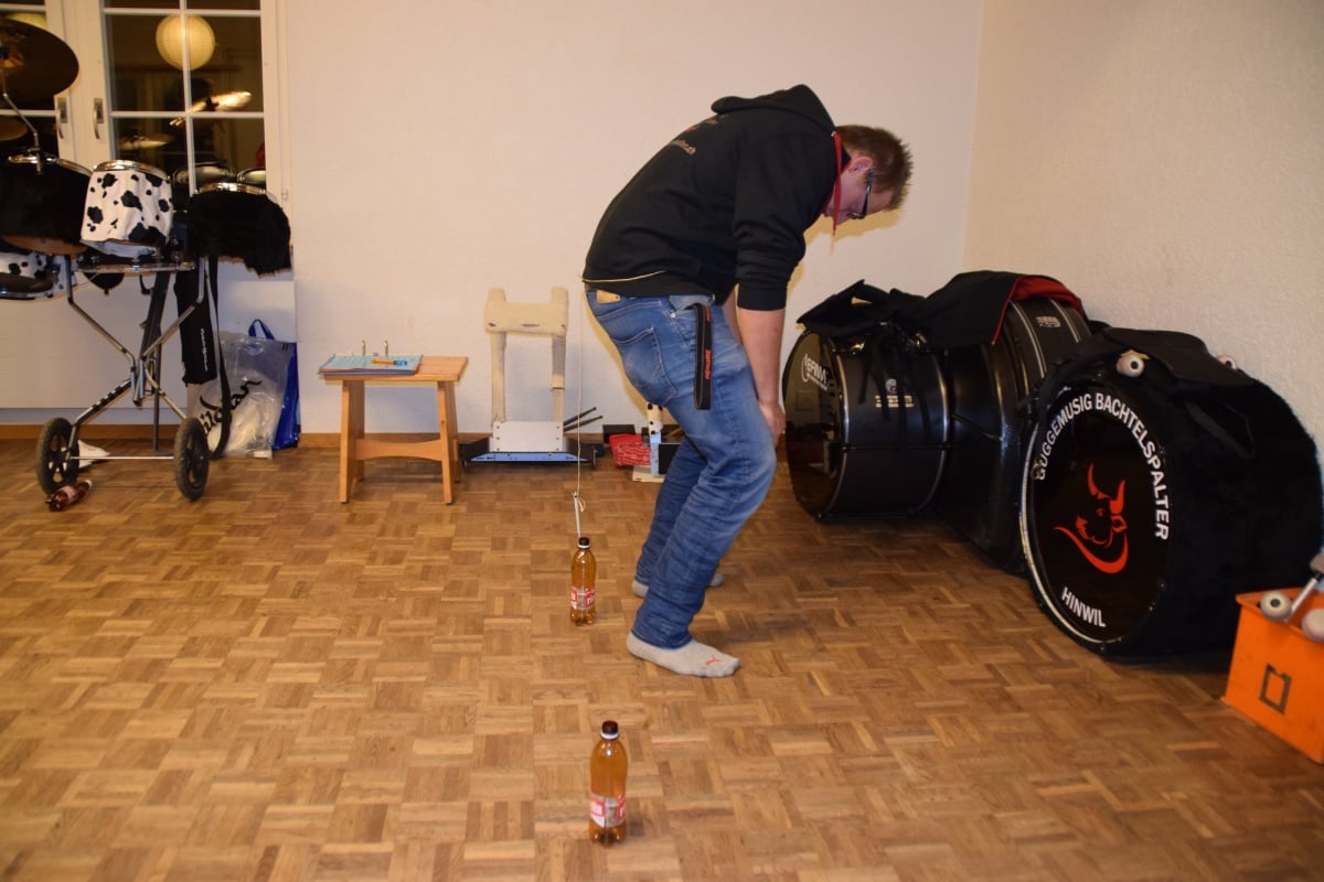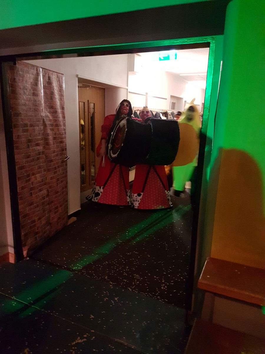 Am 7i isch äs losgange mit schminke. Wo mer dänn alli Farb im Gsicht gha händ hät eusi Heimfasnacht chöne losgah. Am 9i isch euse ersti Uftritt im Hirschesaal gsi. Chum isch er fertig gsi, hämer eusi Instrument id Autos glade und sind uf Steg is Restaurant Lenze go spiele.