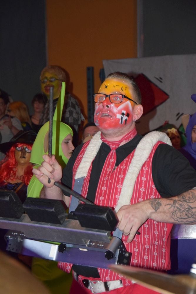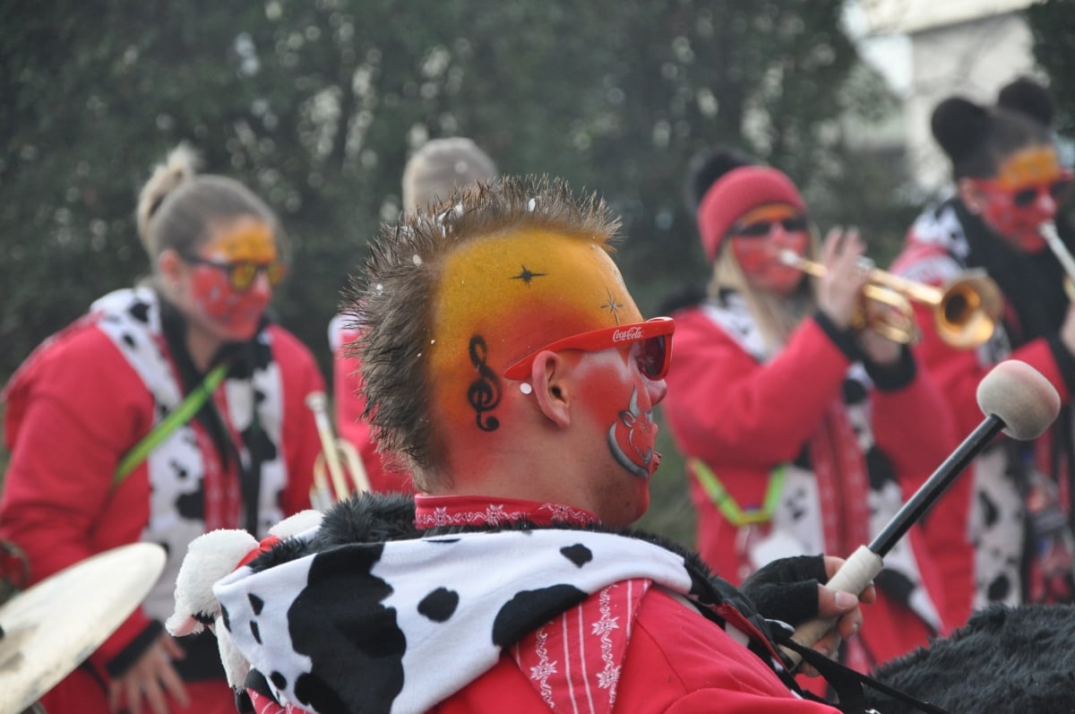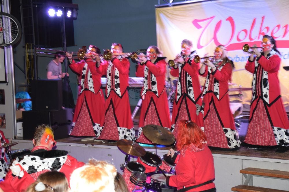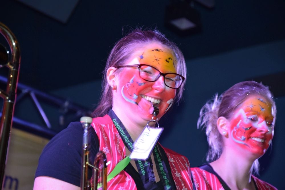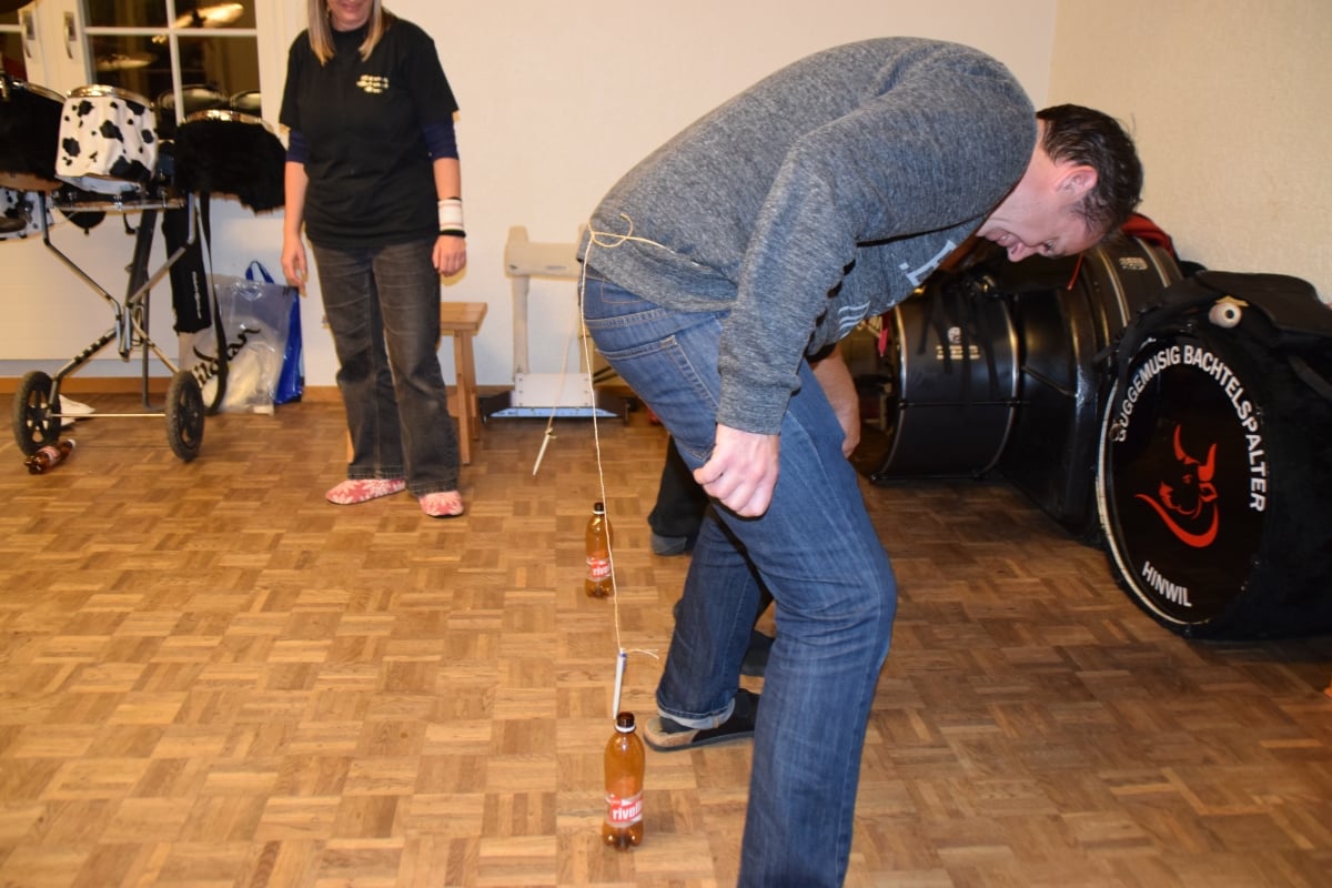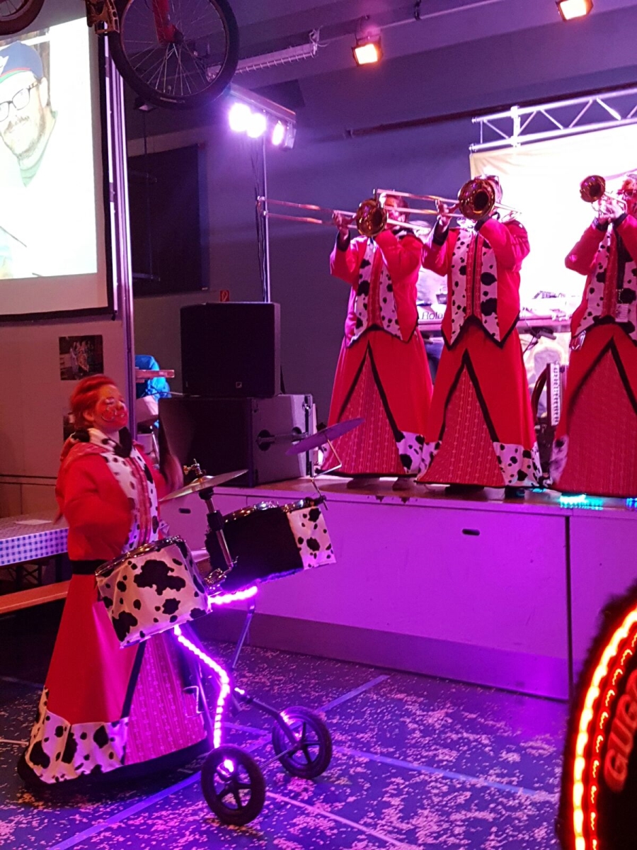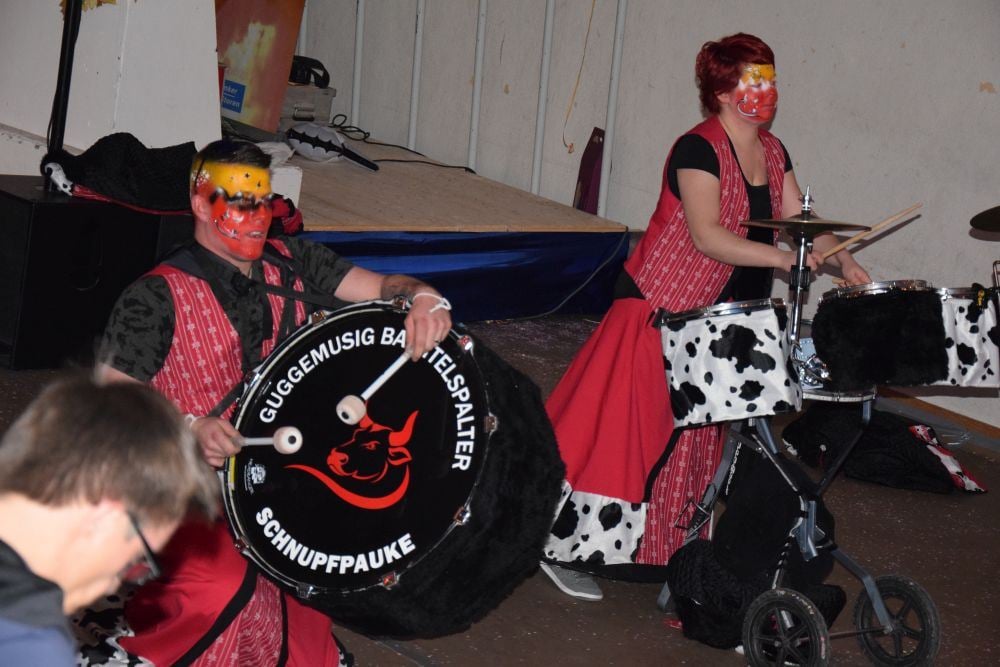 Am 7i isch äs losgange mit schminke. Wo mer dänn alli Farb im Gsicht gha händ hät eusi Heimfasnacht chöne losgah. Am 9i isch euse ersti Uftritt im Hirschesaal gsi. Chum isch er fertig gsi, hämer eusi Instrument id Autos glade und sind uf Steg is Restaurant Lenze go spiele.
