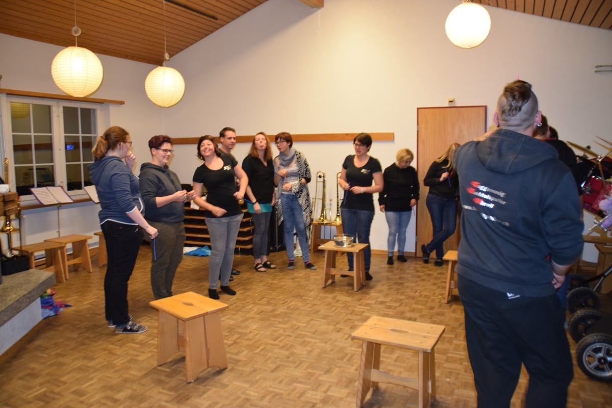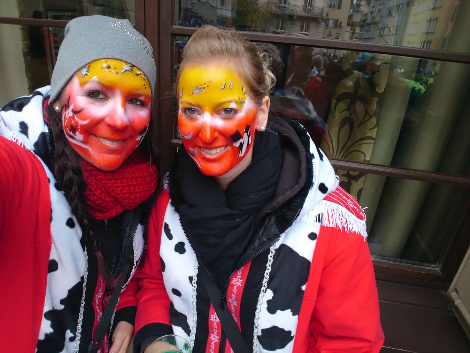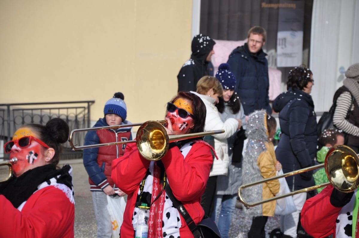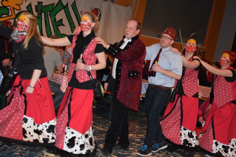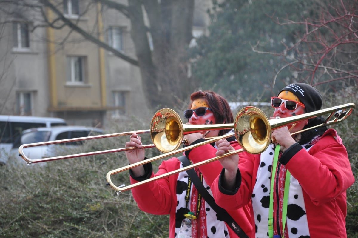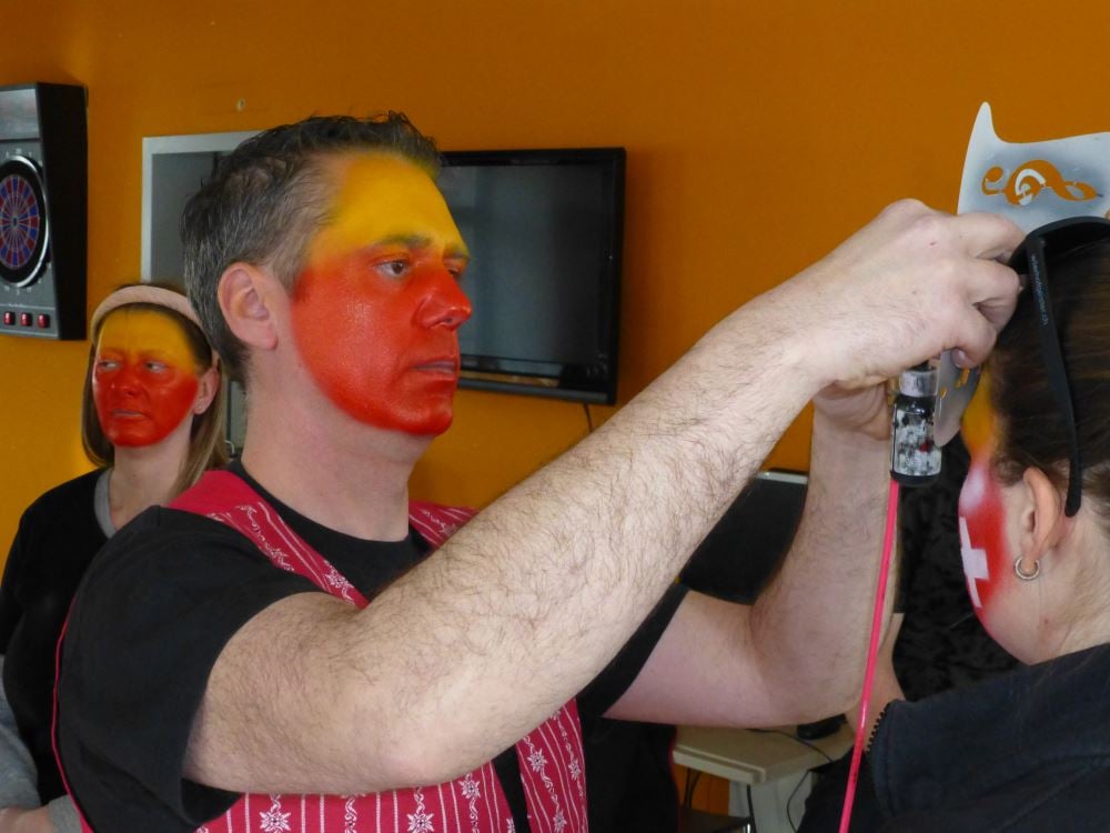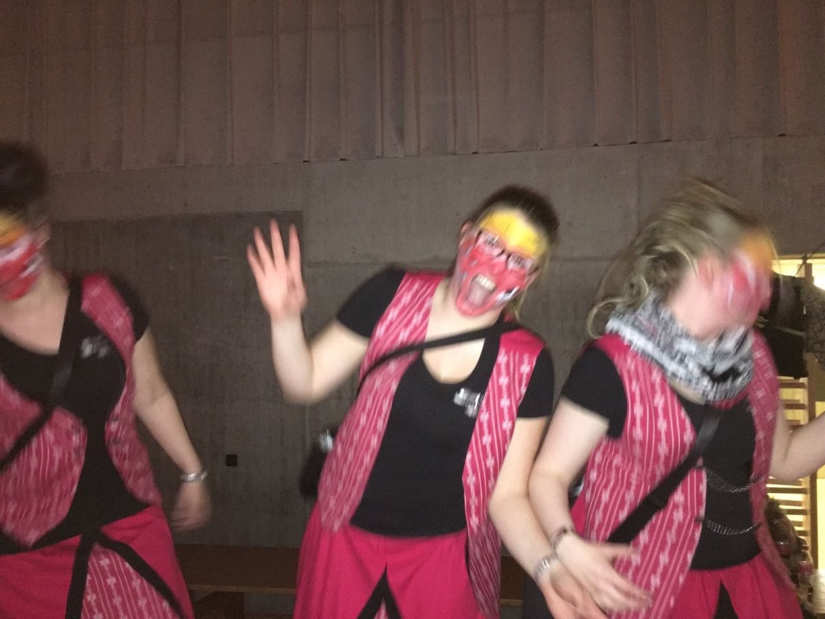 Am 7i isch äs losgange mit schminke. Wo mer dänn alli Farb im Gsicht gha händ hät eusi Heimfasnacht chöne losgah. Am 9i isch euse ersti Uftritt im Hirschesaal gsi. Chum isch er fertig gsi, hämer eusi Instrument id Autos glade und sind uf Steg is Restaurant Lenze go spiele.