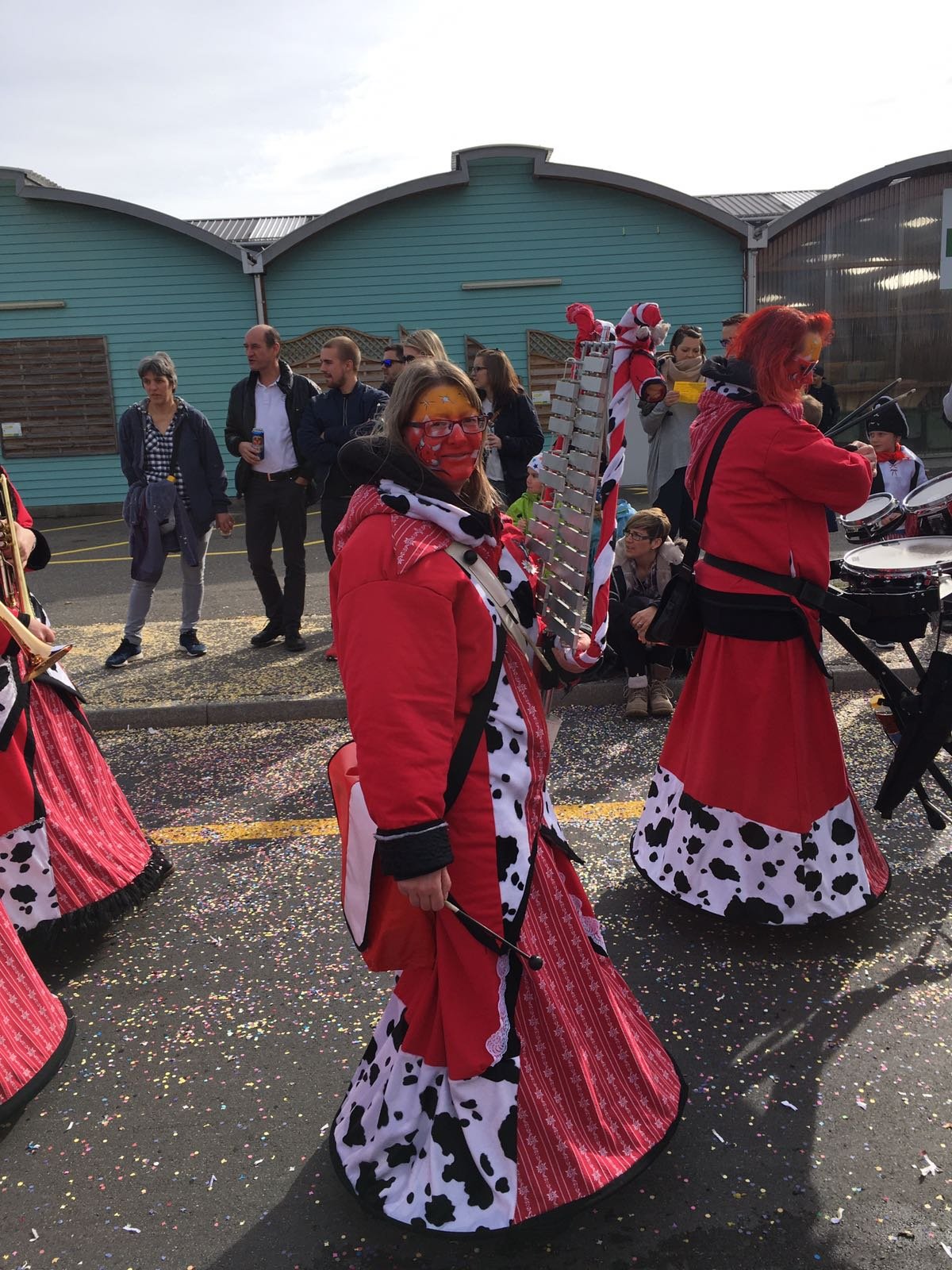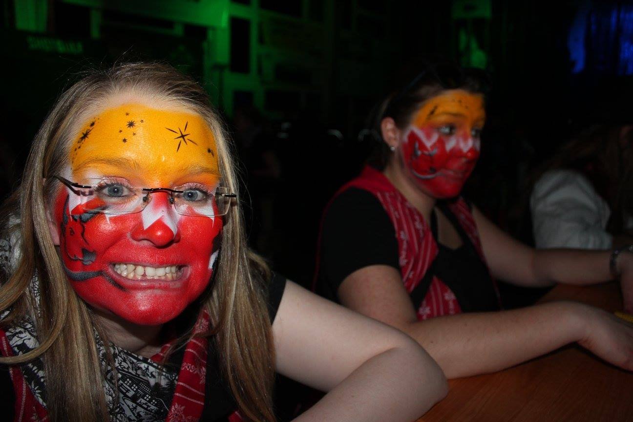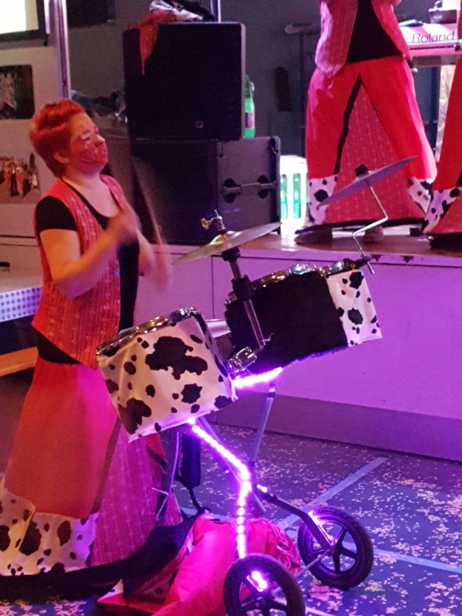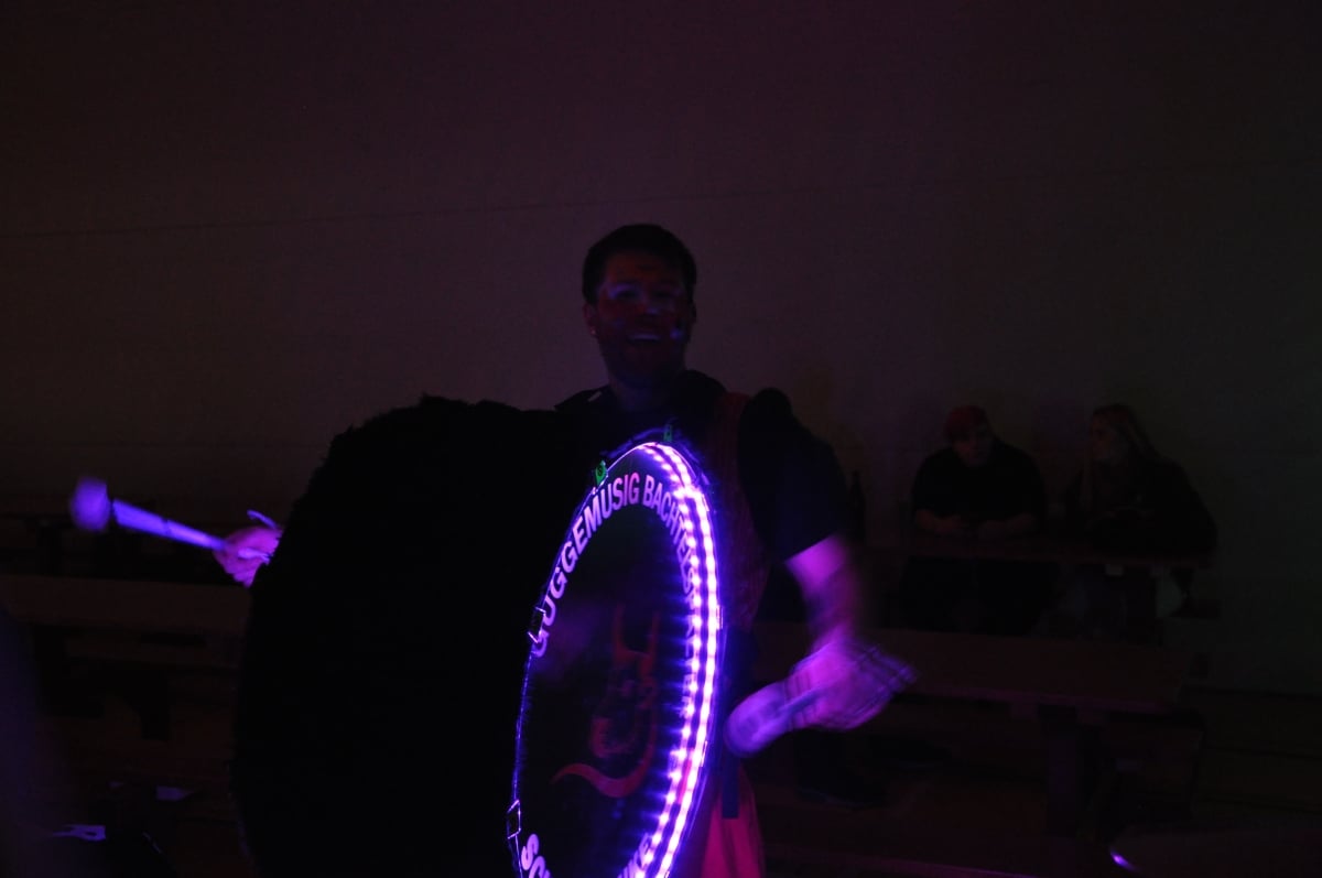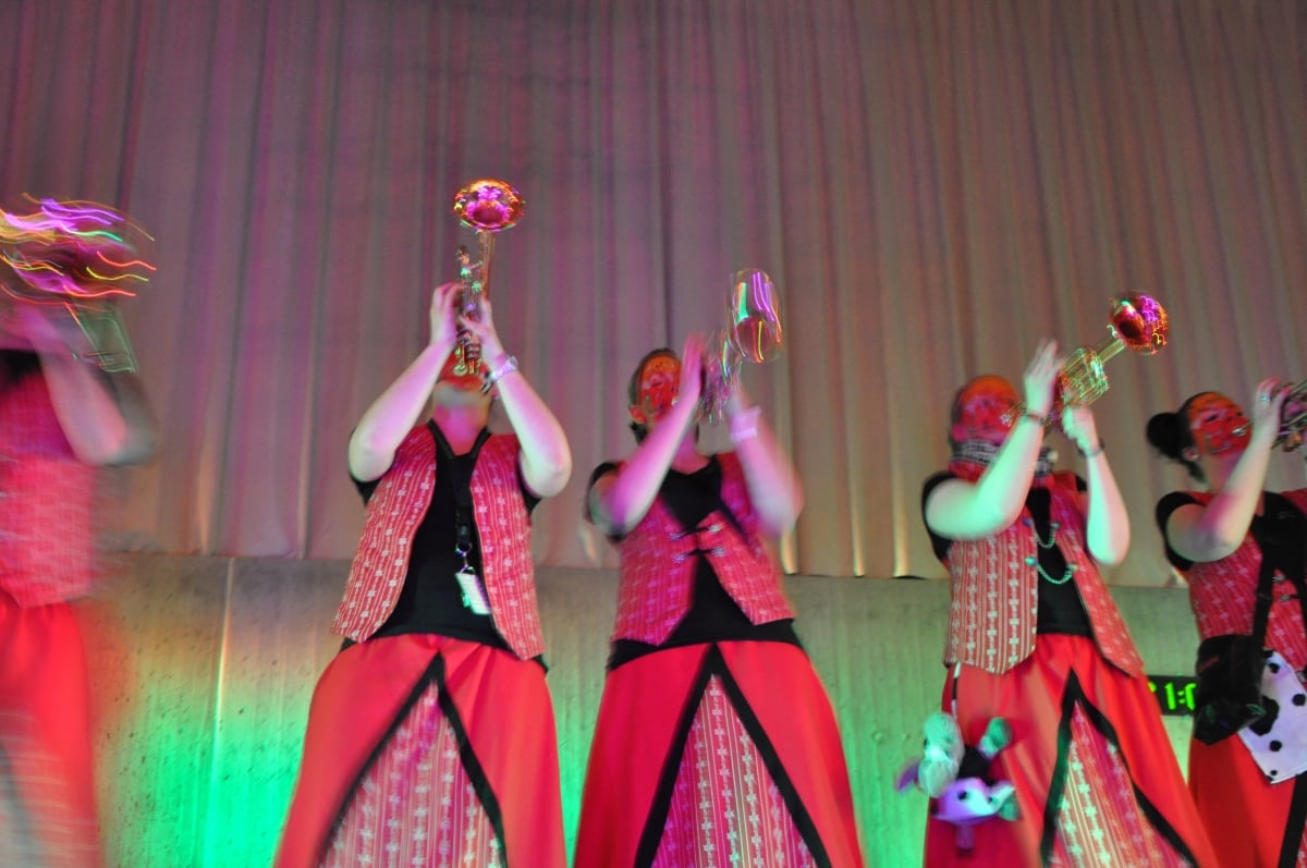 Am 7i isch äs losgange mit schminke. Wo mer dänn alli Farb im Gsicht gha händ hät eusi Heimfasnacht chöne losgah. Am 9i isch euse ersti Uftritt im Hirschesaal gsi. Chum isch er fertig gsi, hämer eusi Instrument id Autos glade und sind uf Steg is Restaurant Lenze go spiele.